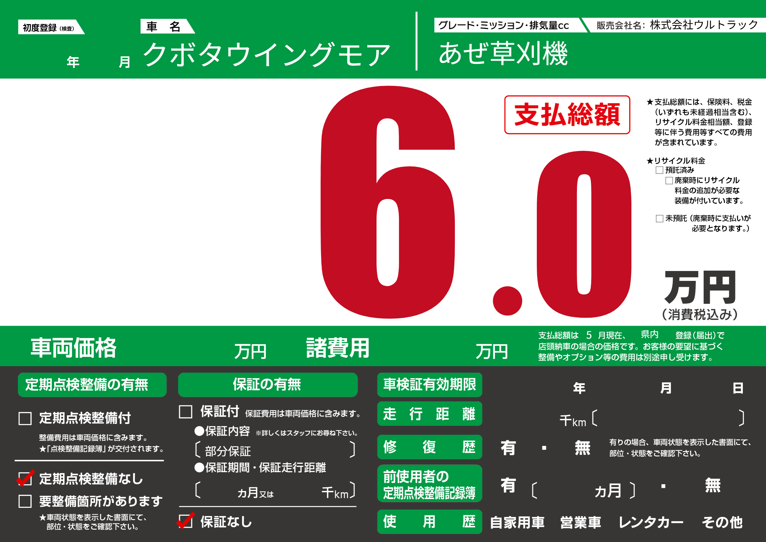 | 車名 | クボタウイングモア | グレード ミッション 排気量 |