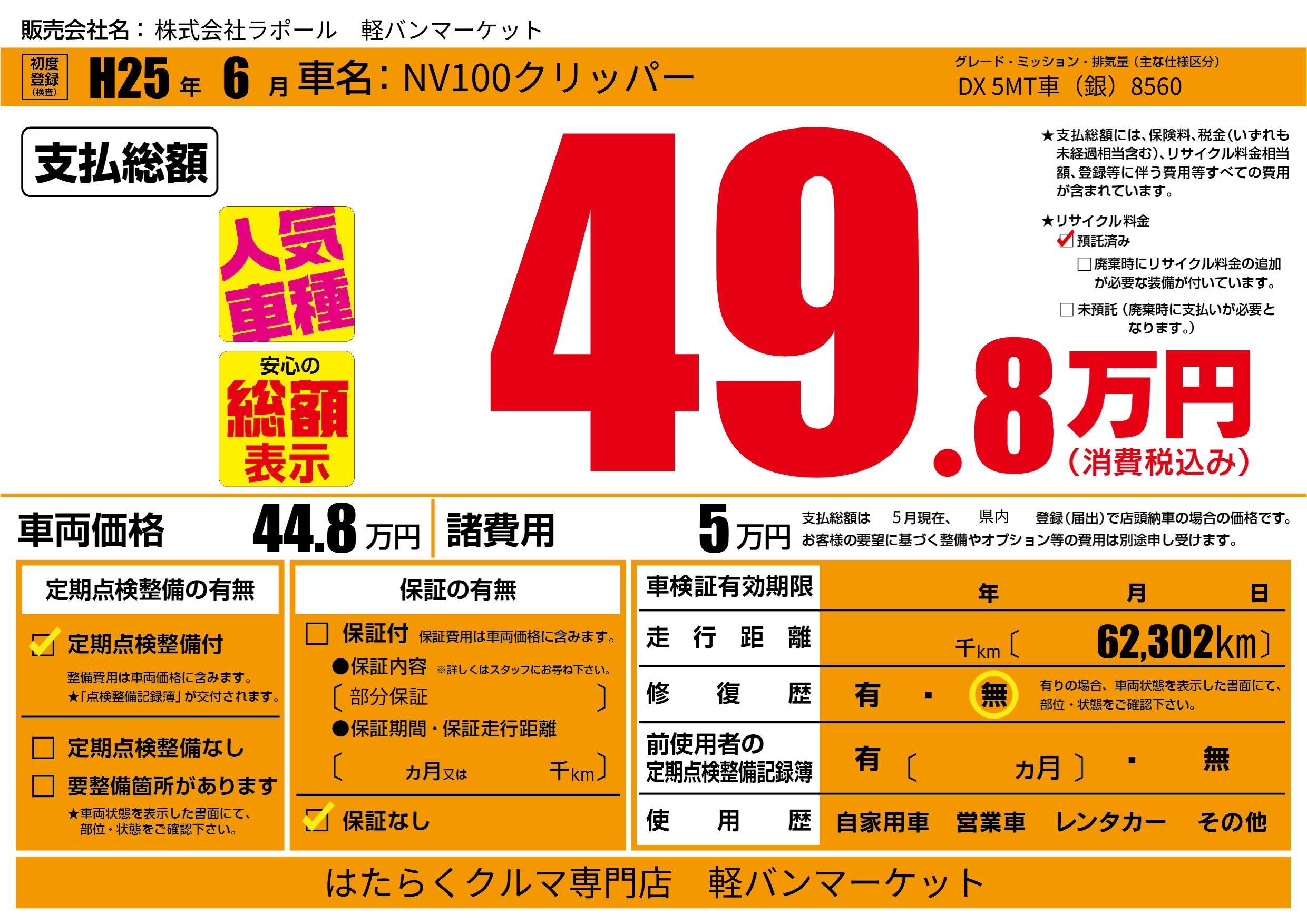 保証なし 保証内容(部分保証) ---ヶ月または()千kmまで |