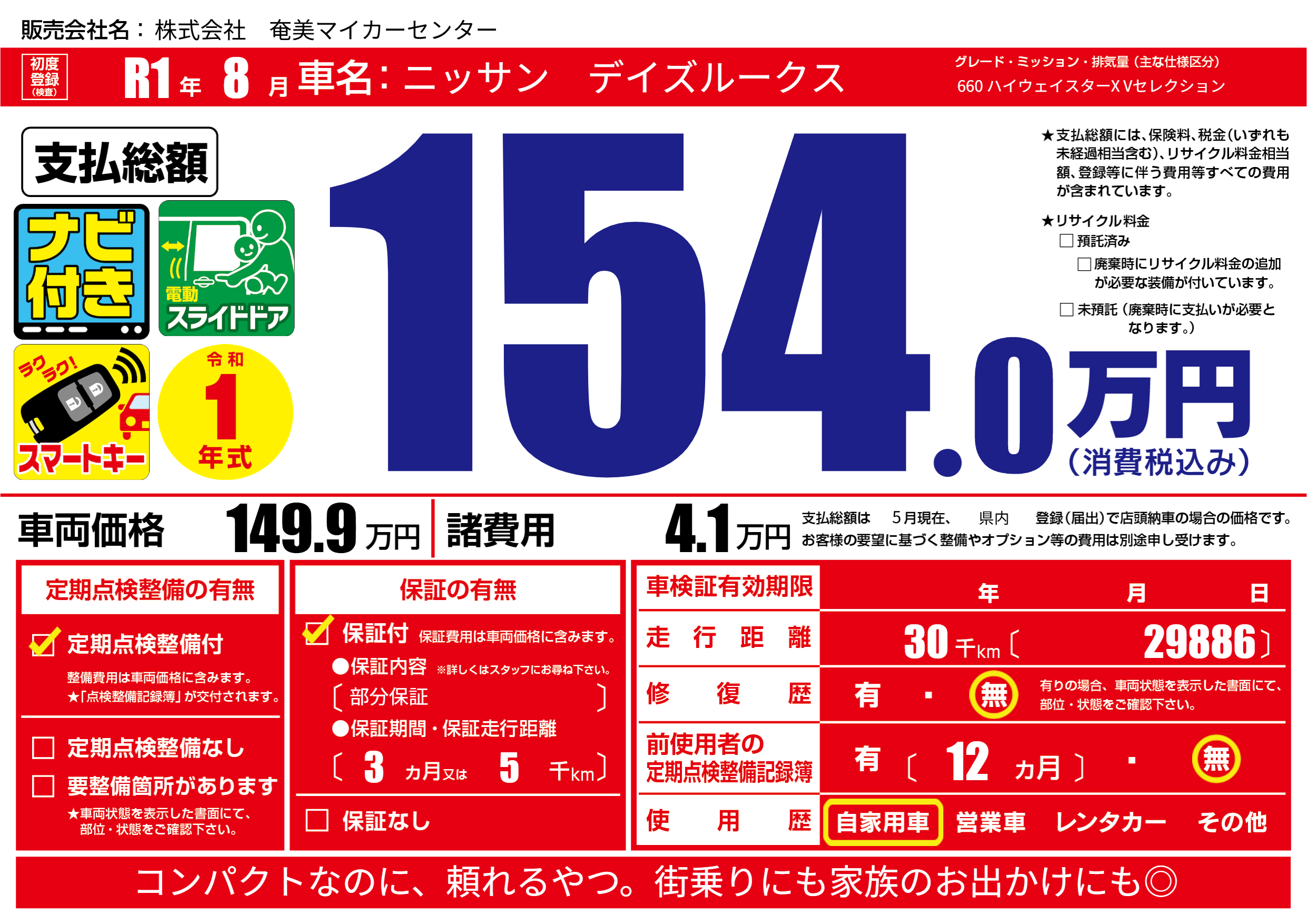 | 走行キロ | 3万km | 初年度登録 | R1年8月 |
