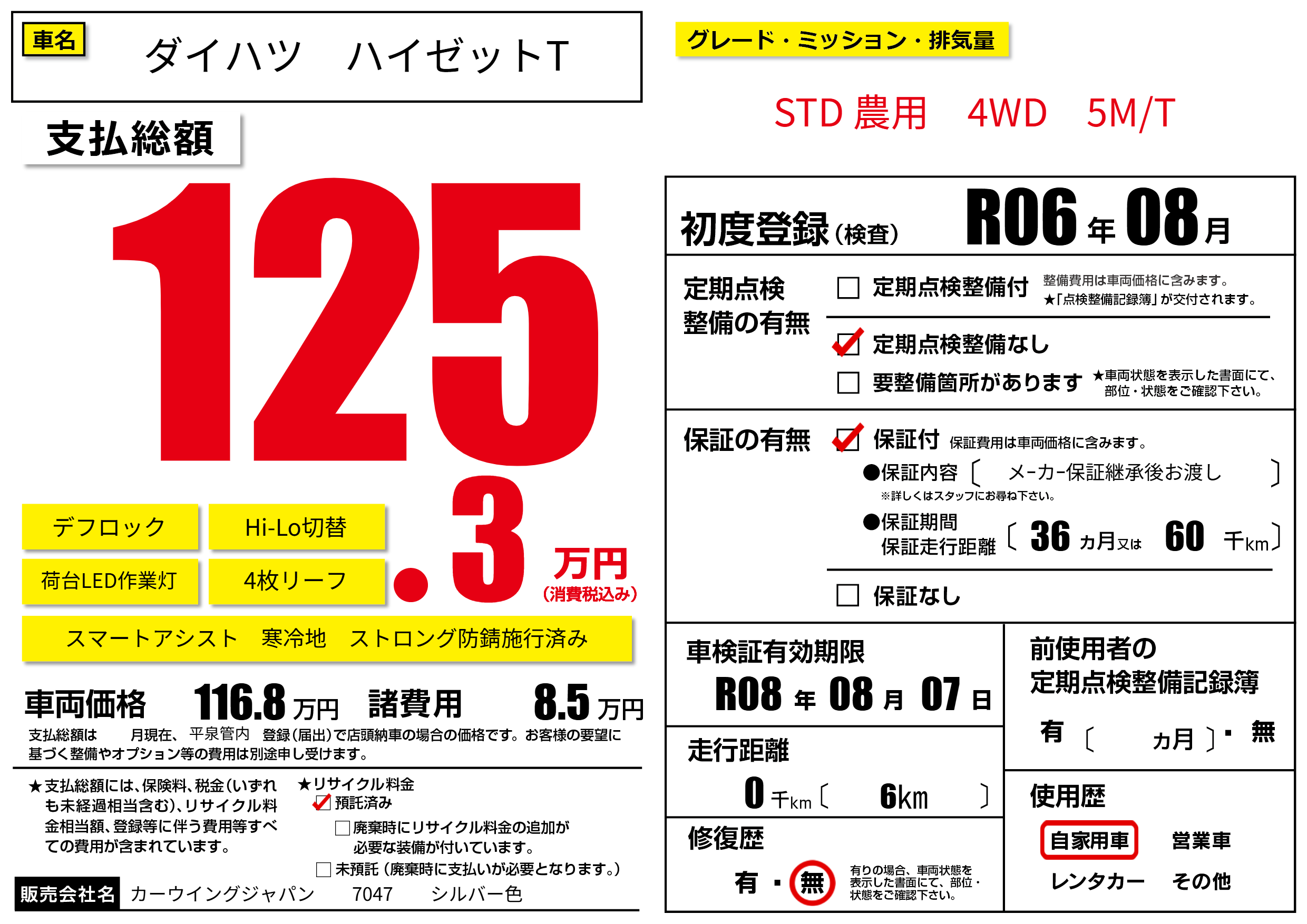 | 走行キロ | - | 初年度登録 | R06年08月 |