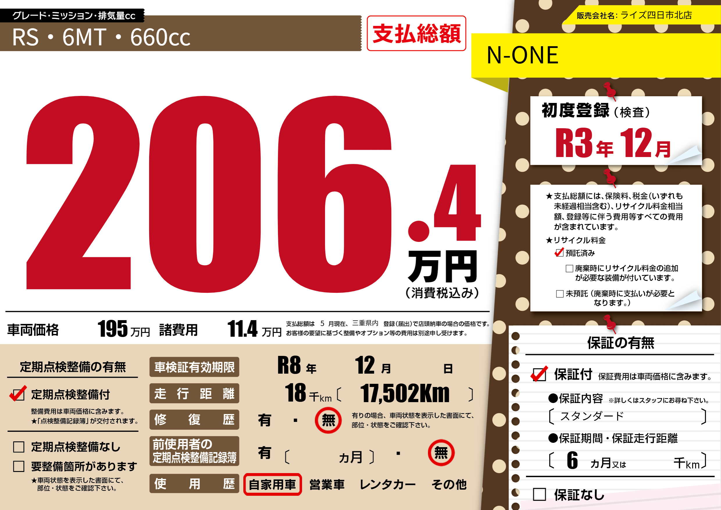 | 車名 | N-ONE | グレード ミッション 排気量 |