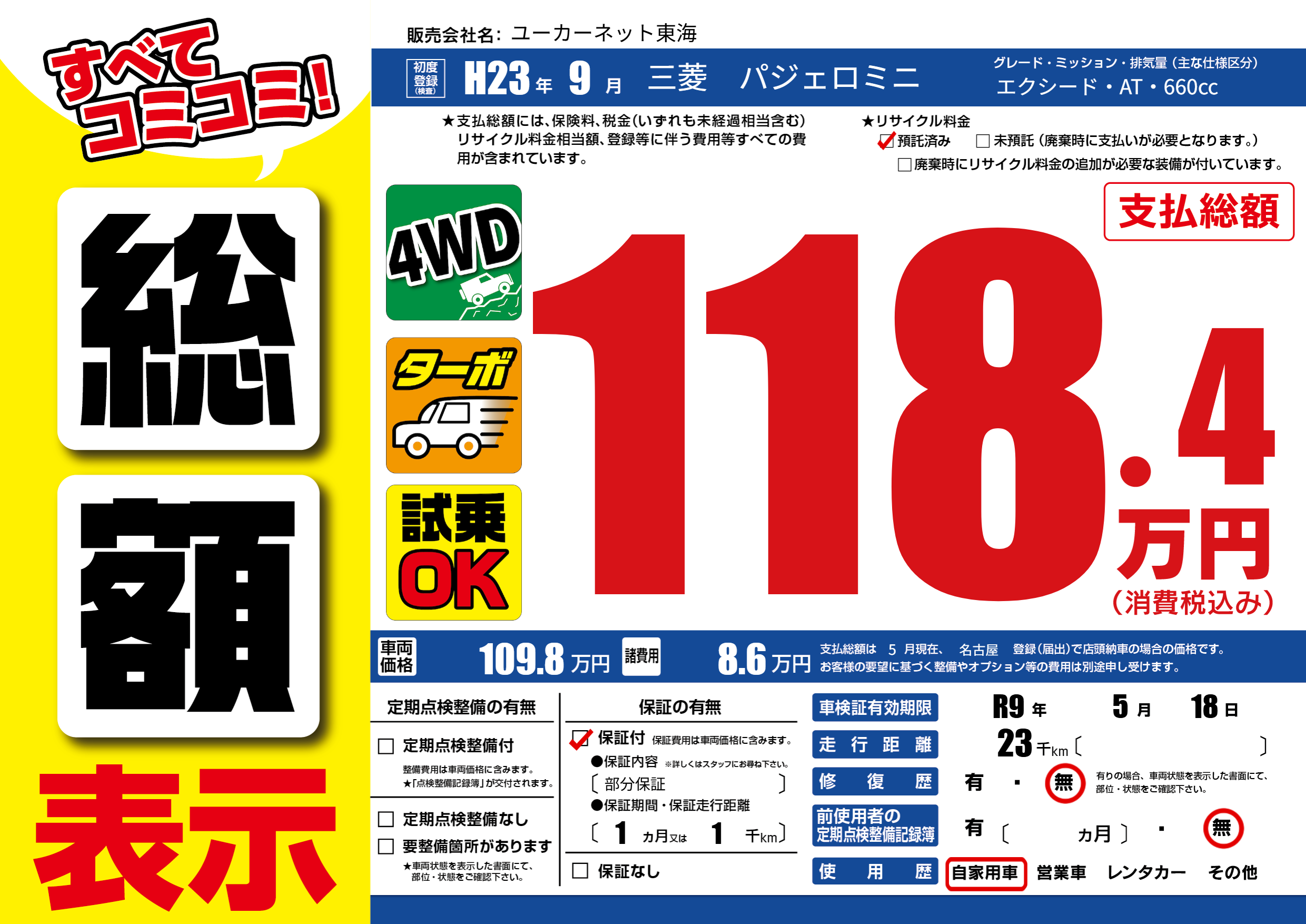 | 車名 | 三菱 パジェロミニ | グレード ミッション 排気量 |