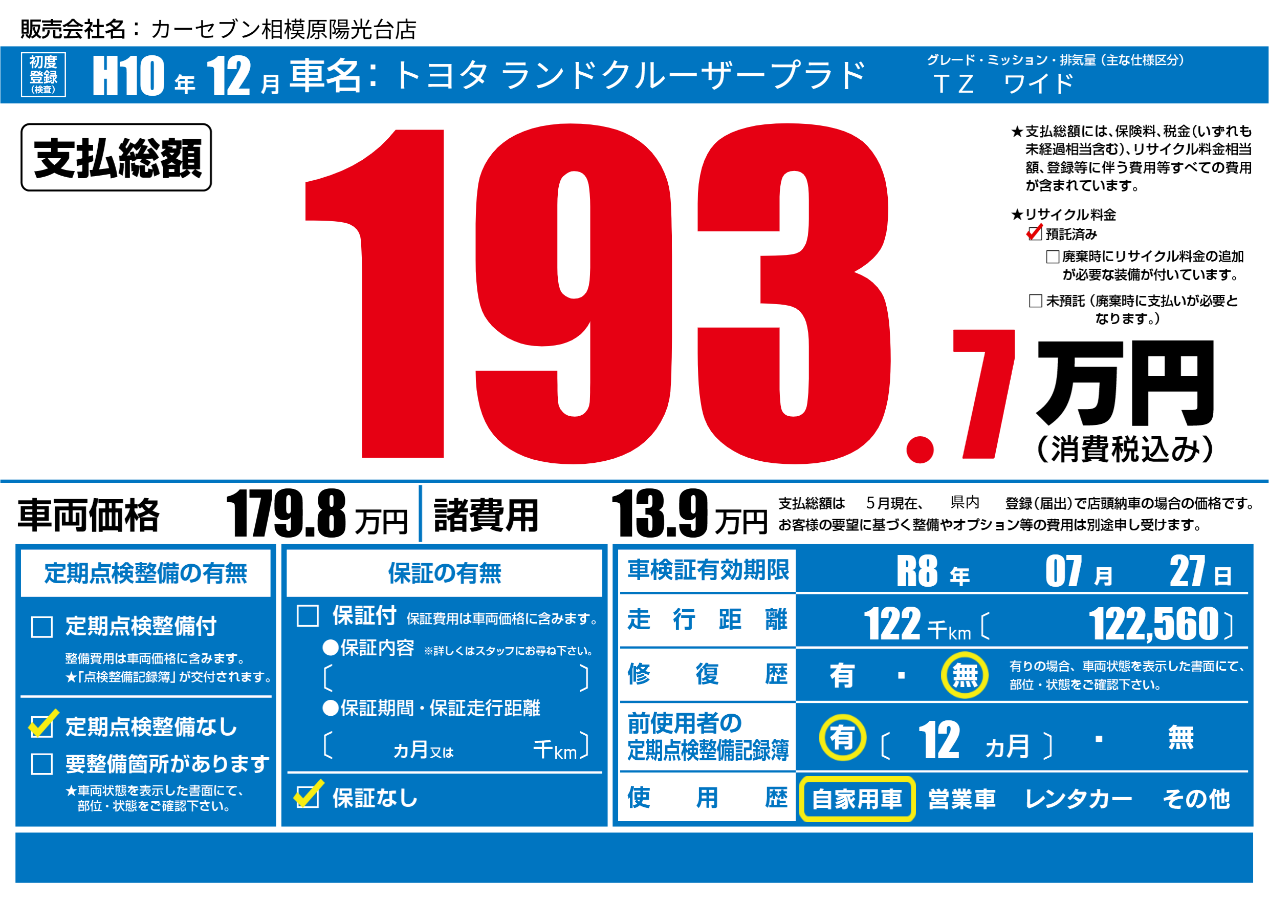| 車名 | トヨタ ランドクルーザープラド | グレード ミッション 排気量 |