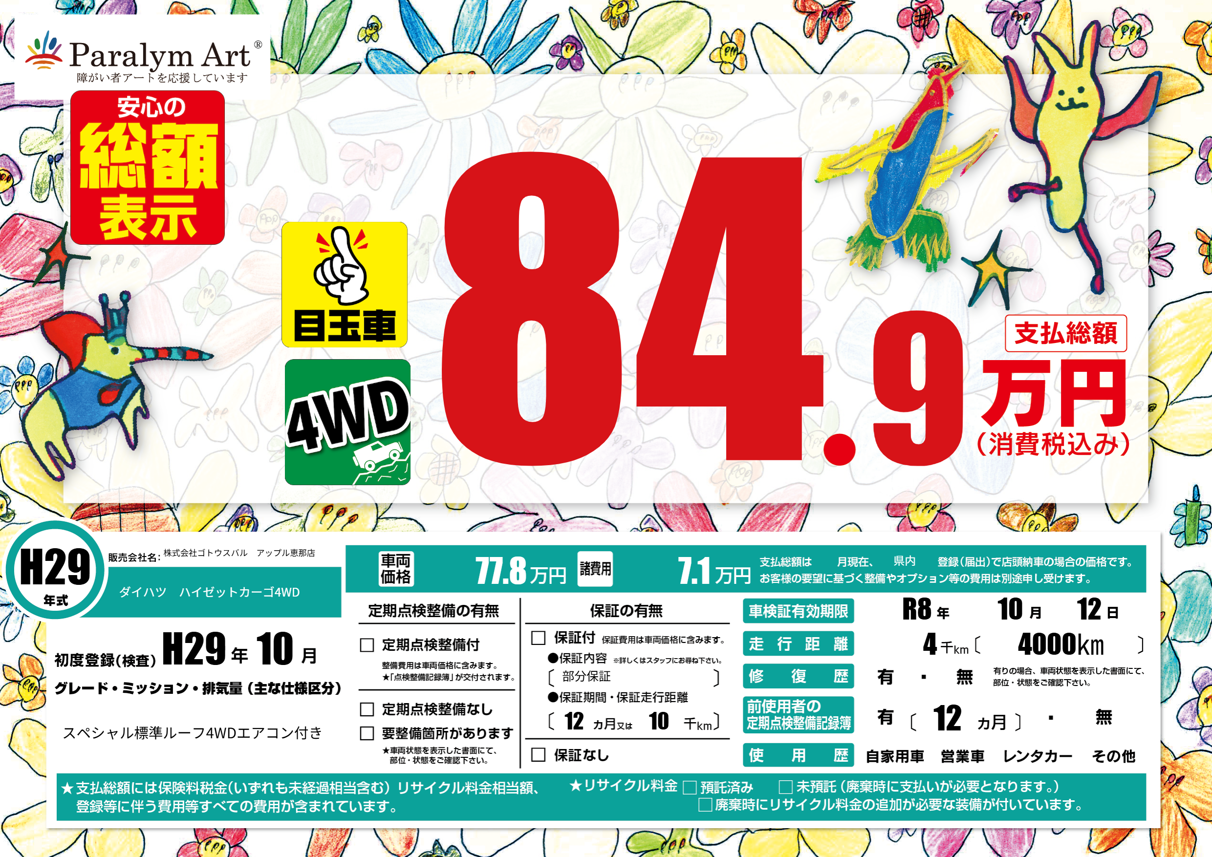 | 車名 | ダイハツ ハイゼットカーゴ4WD | グレード ミッション 排気量 |