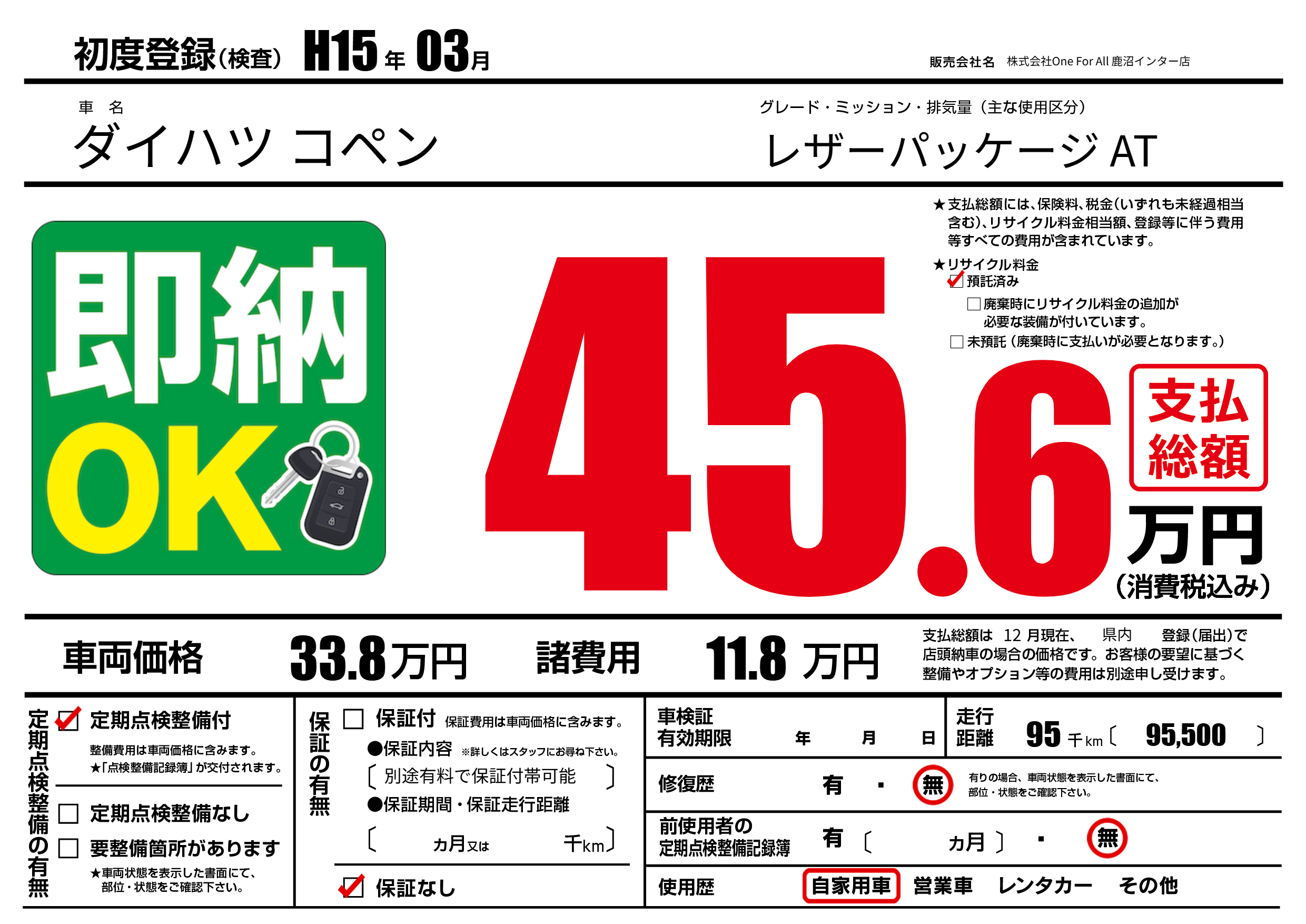 保証なし 保証内容(別途有料で保証付帯可能) ---ヶ月または()千kmまで |