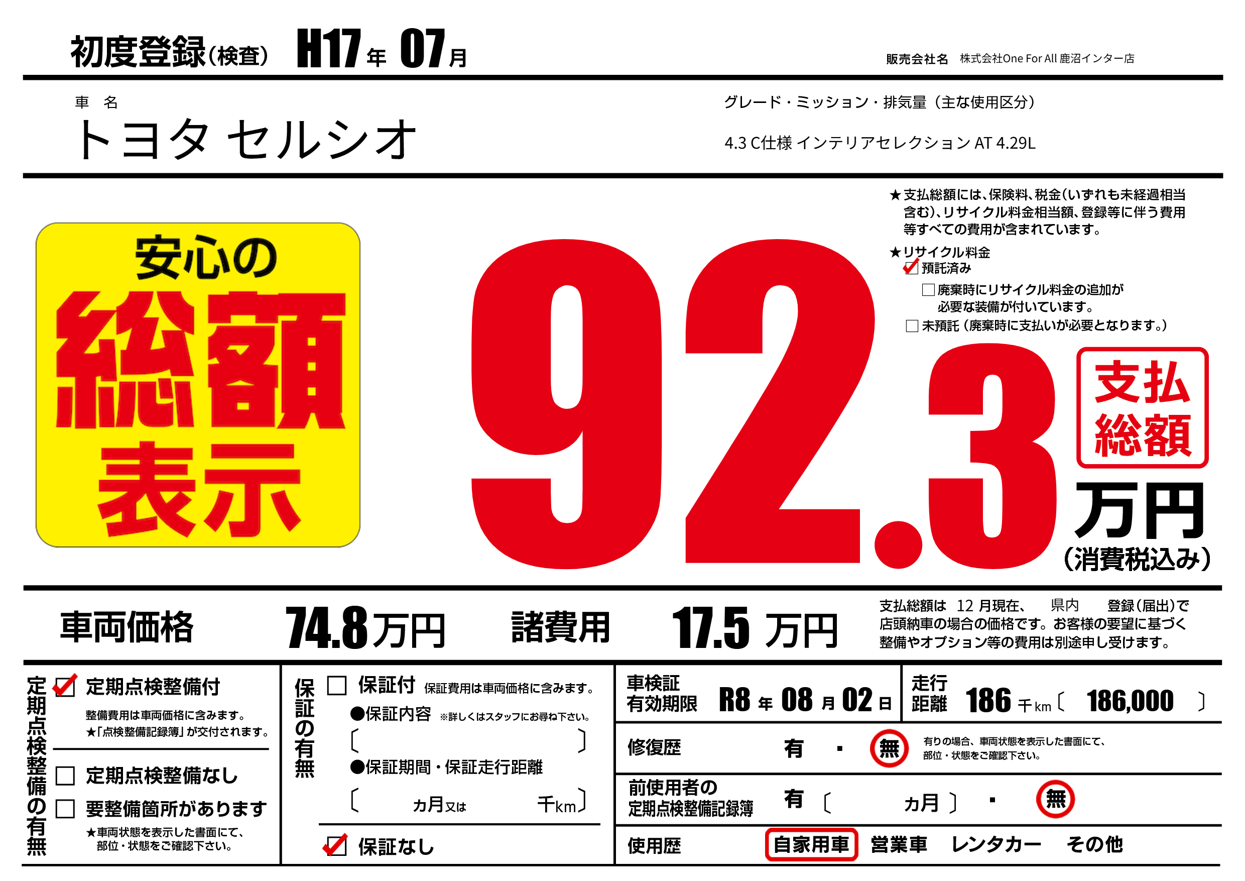 | 走行キロ | 18.6万km | 初年度登録 | H17年07月 |