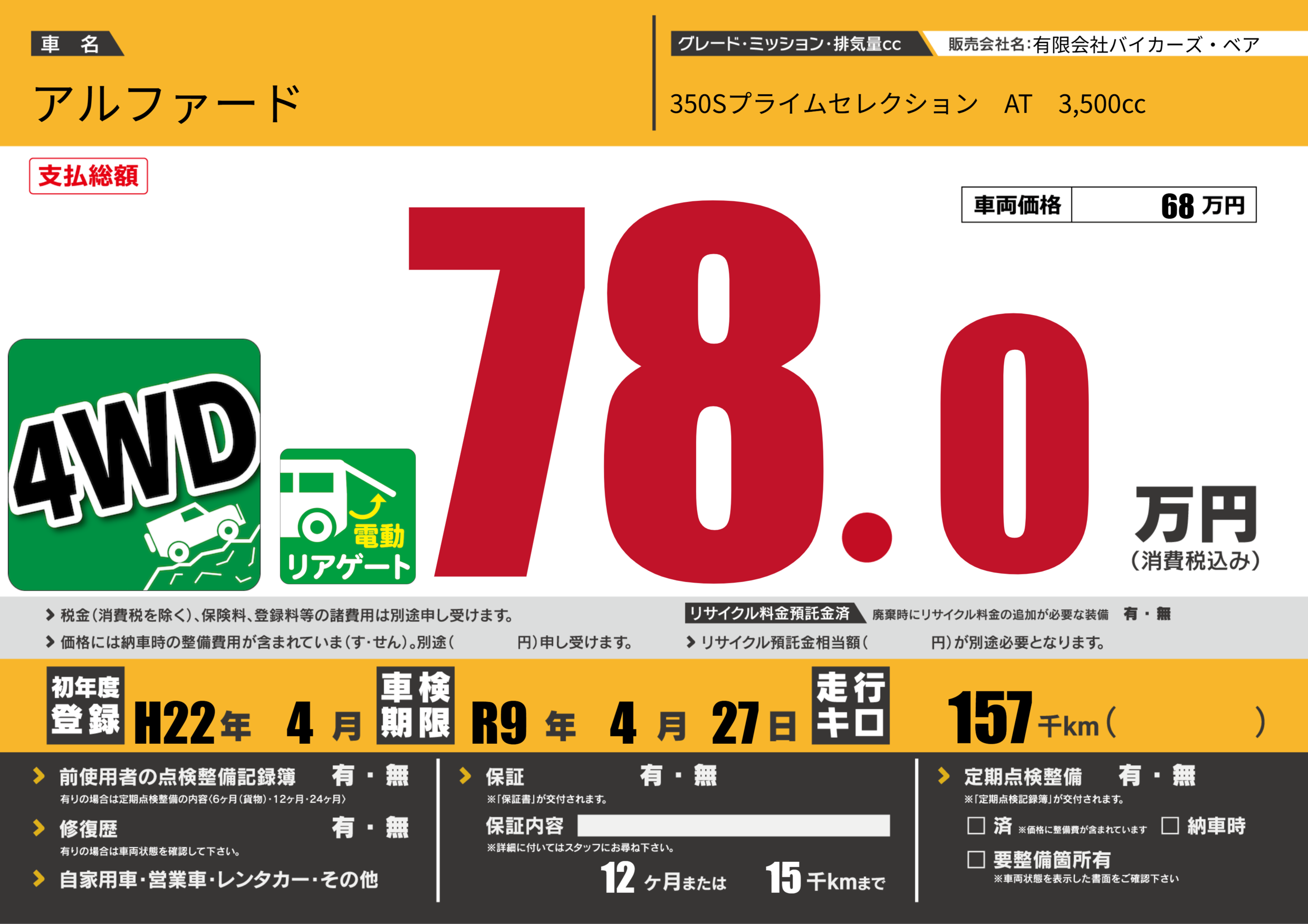 | 走行キロ | 15.7万km | 初年度登録 | H22年4月 |