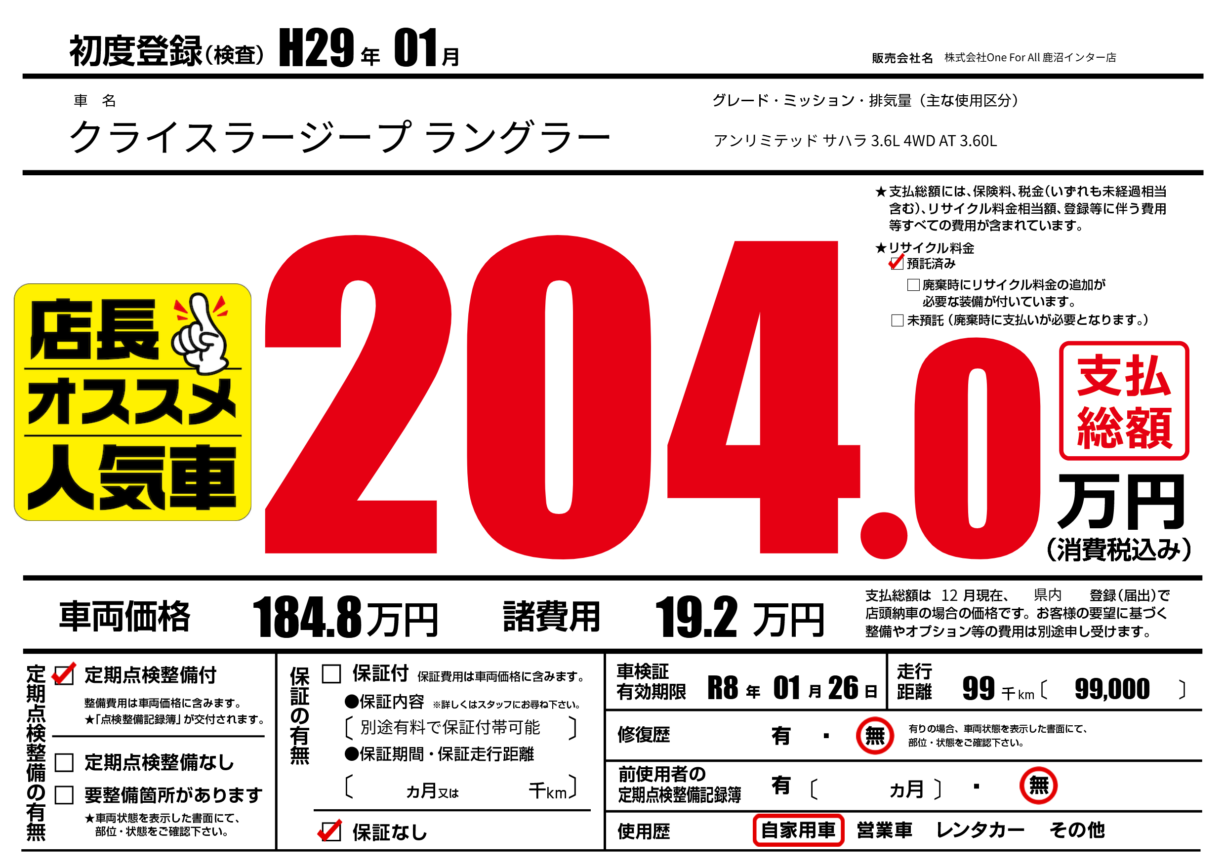 | 車名 | クライスラージープ ラングラー | グレード ミッション 排気量 |