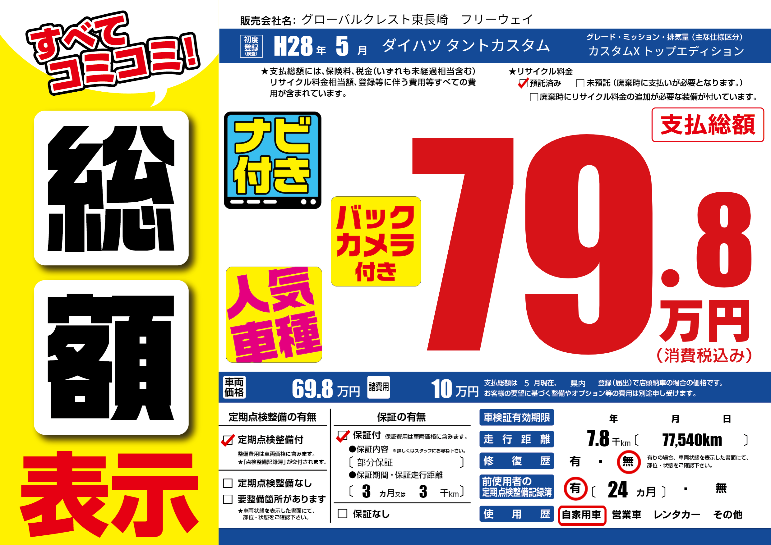 | 走行キロ | 0.7万km | 初年度登録 | H28年5月 |