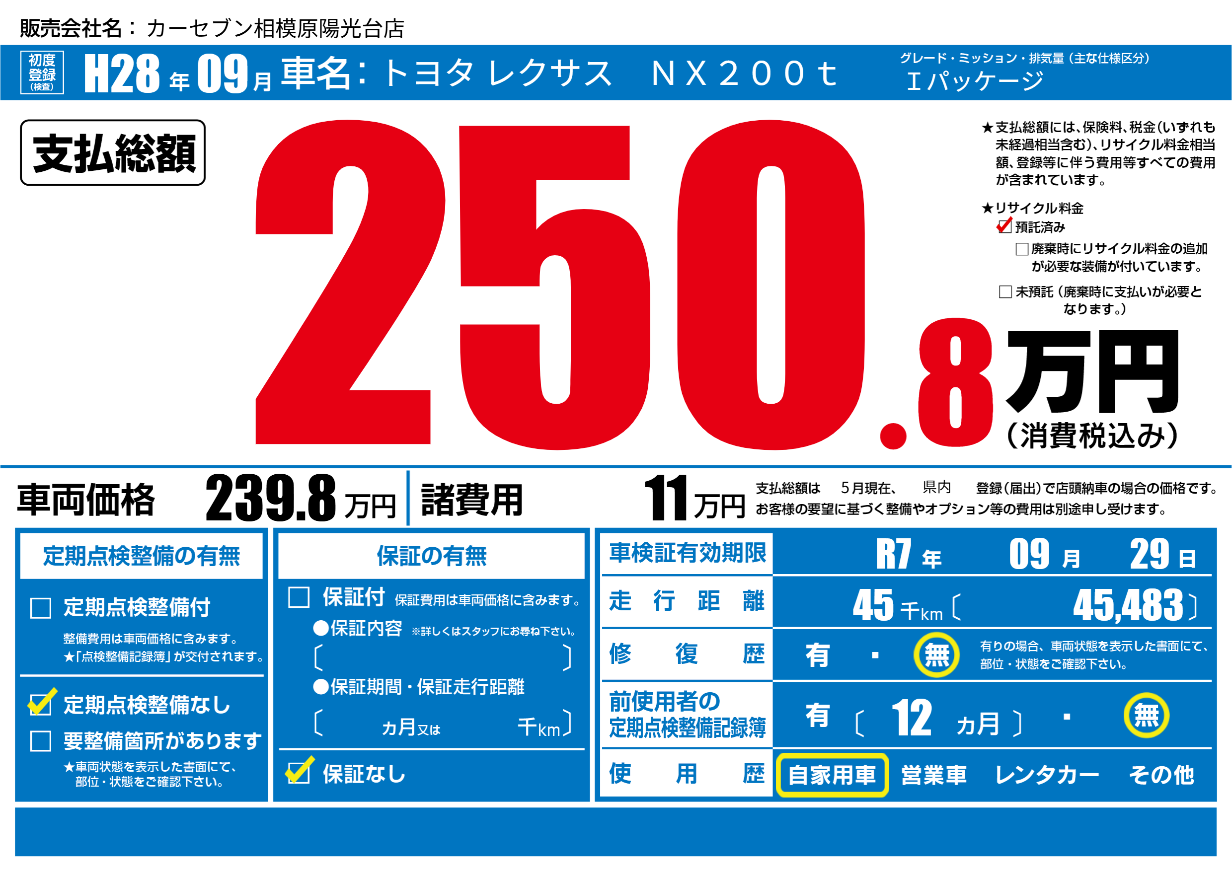 | 車名 | トヨタ レクサス NX200t | グレード ミッション 排気量 |