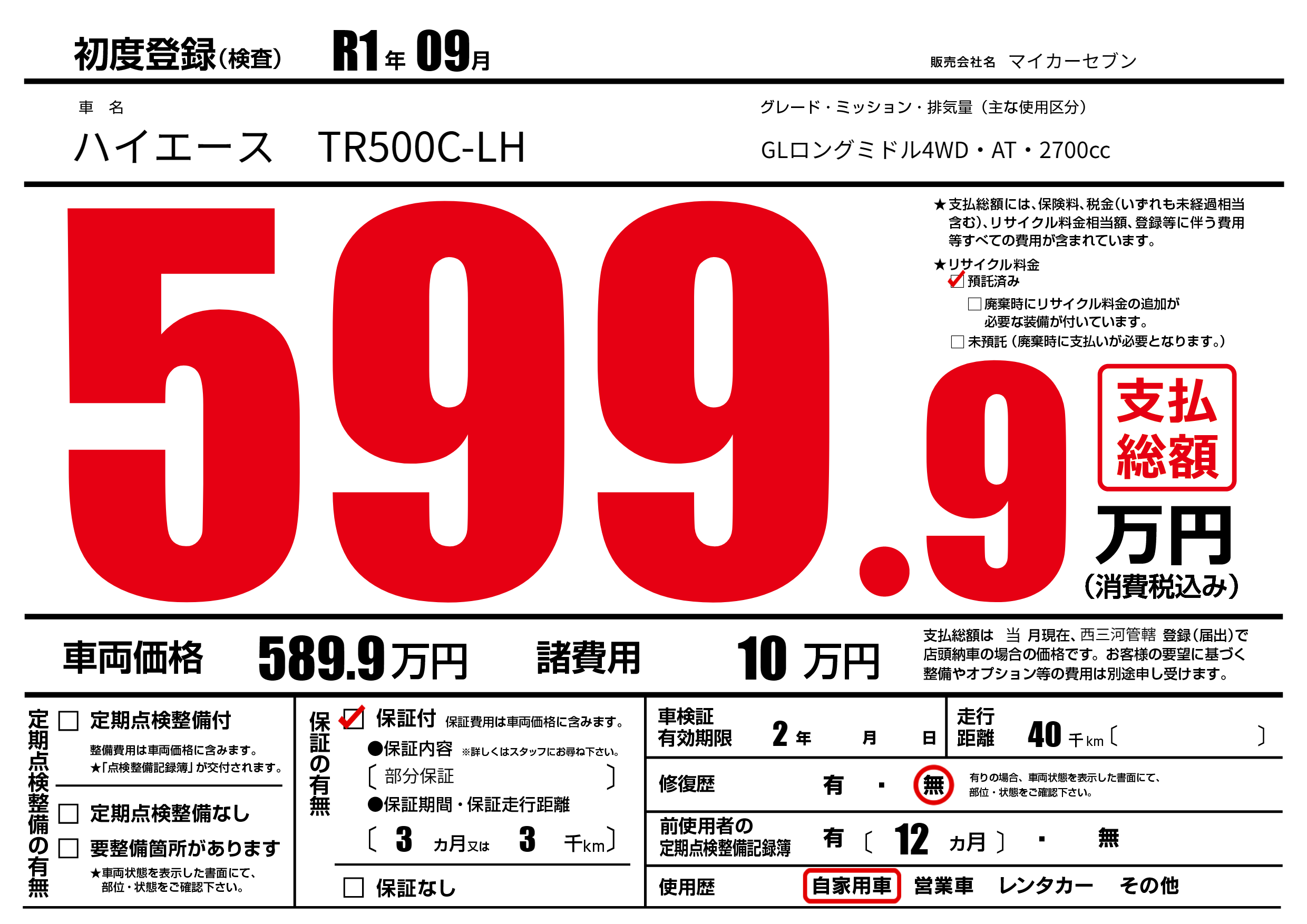 | 車名 | ハイエース TR500C-LH | グレード ミッション 排気量 |
