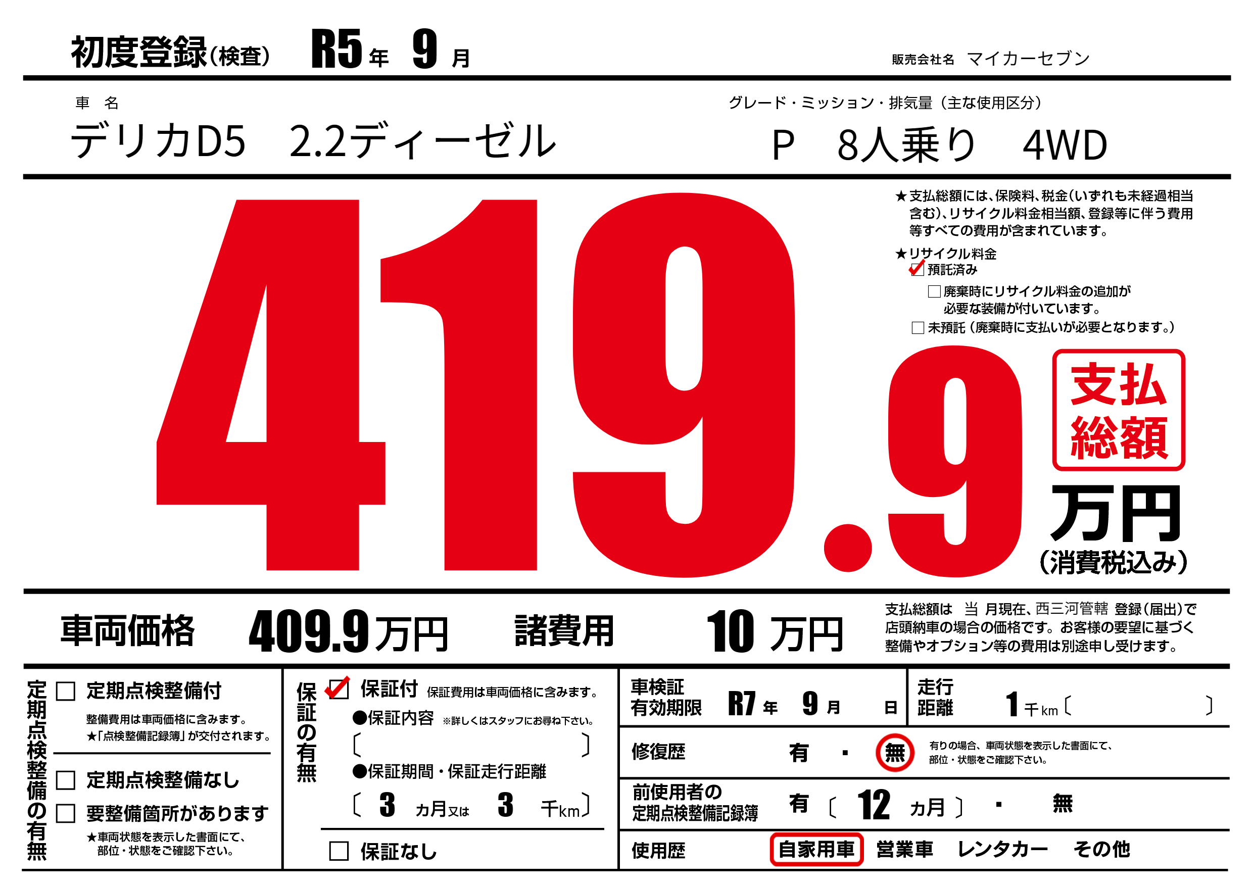 | 車名 | デリカD5 2.2ディーゼル | グレード ミッション 排気量 |