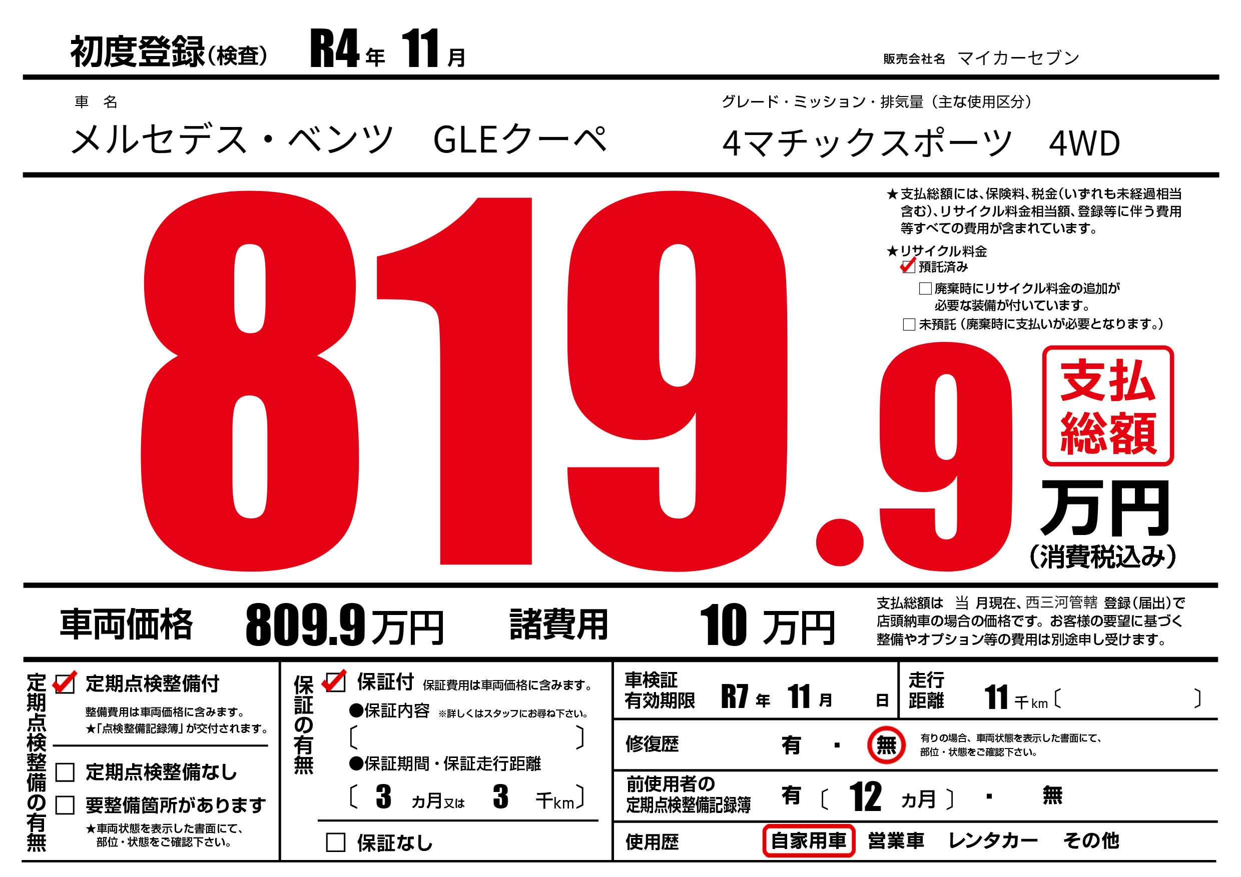 | 車名 | メルセデス・ベンツ GLEクーペ | グレード ミッション 排気量 |