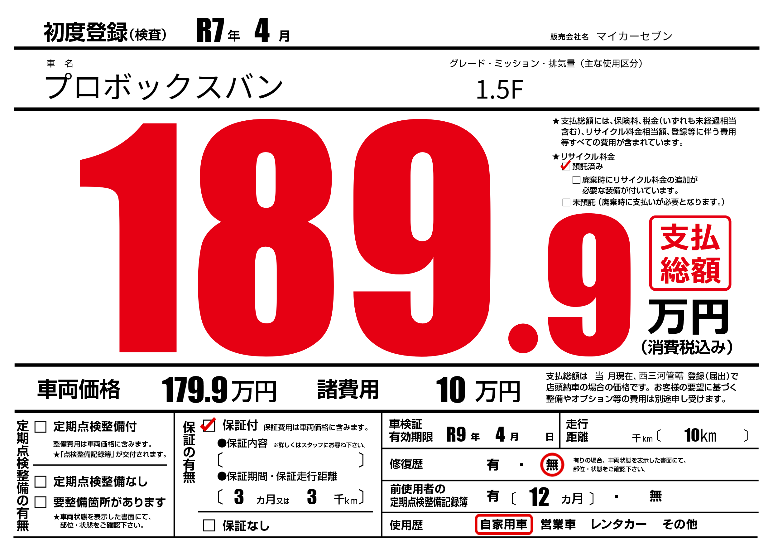 | 車名 | プロボックスバン | グレード ミッション 排気量 |