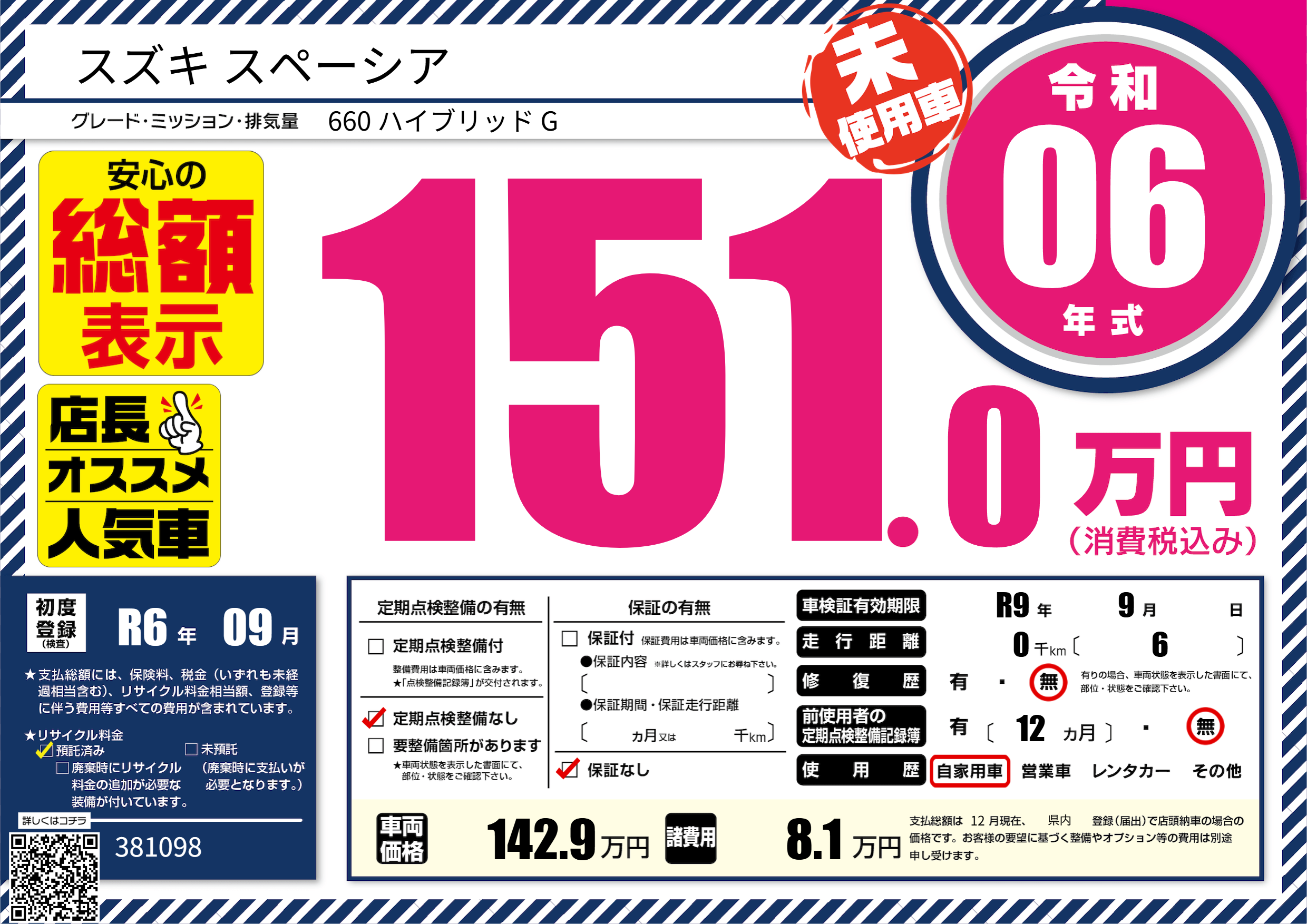 | 走行キロ | - | 初年度登録 | R6年09月 |