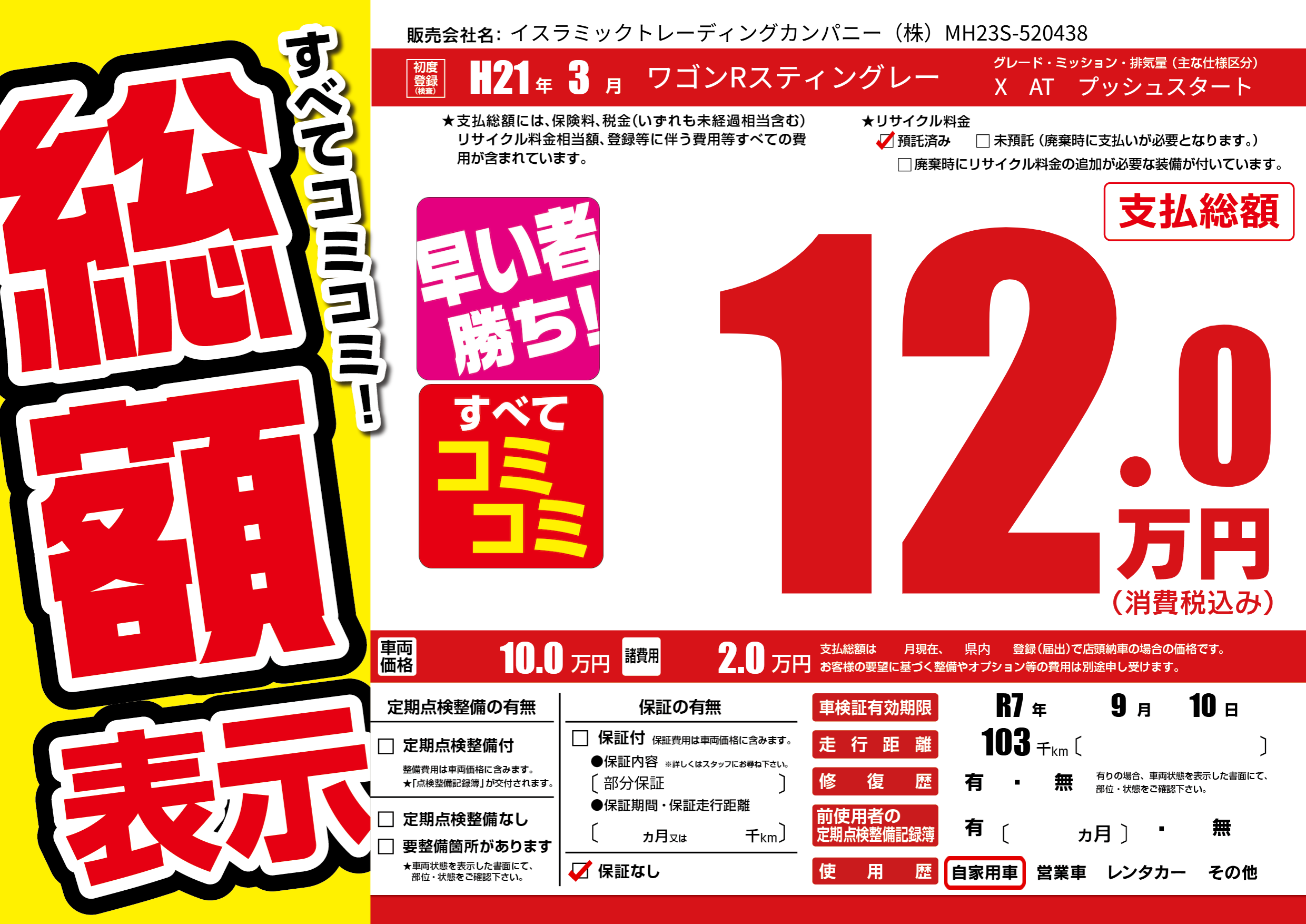 | 走行キロ | 10.3万km | 初年度登録 | H21年3月 |