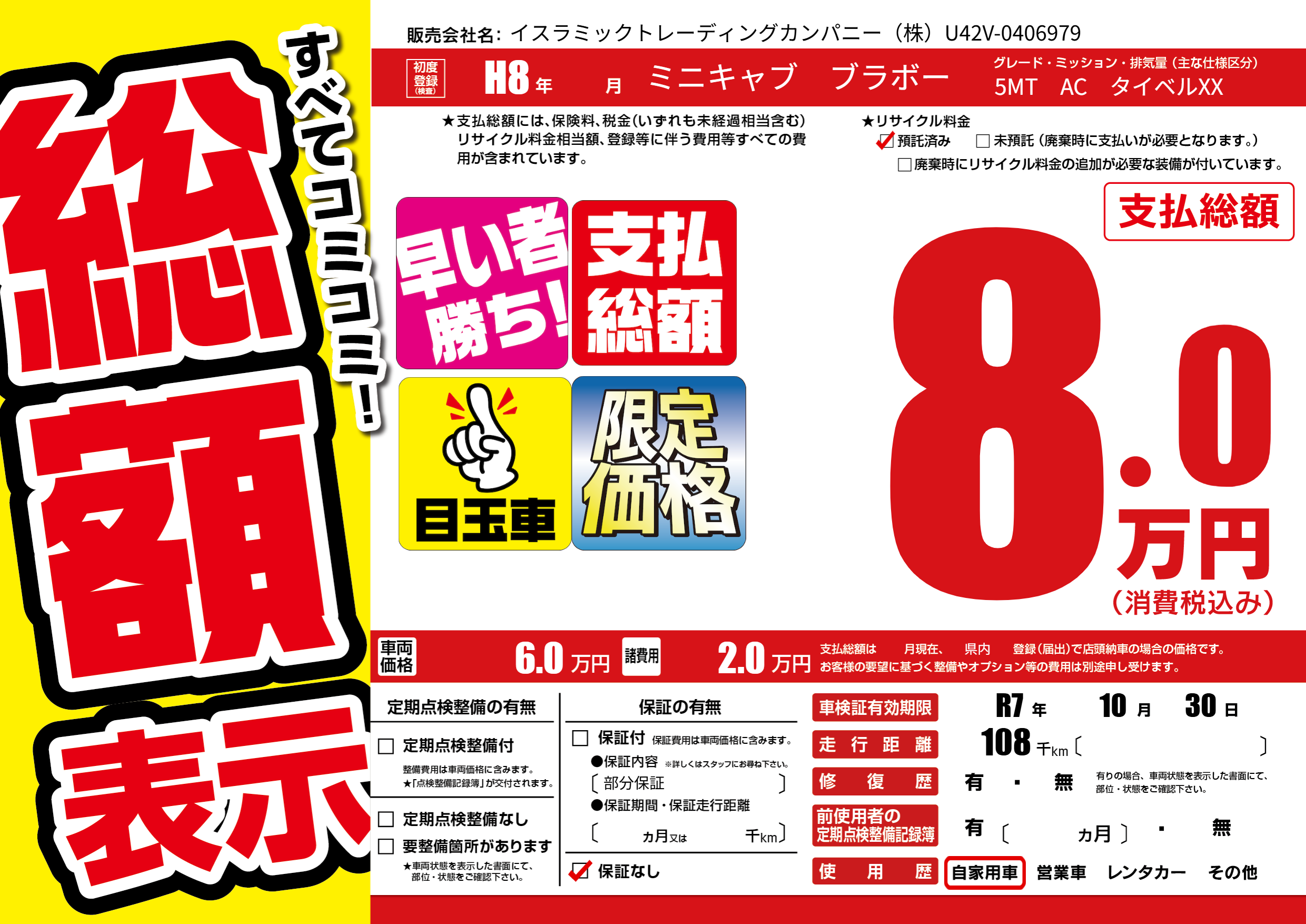 | 走行キロ | 10.8万km | 初年度登録 | H8年---月 |