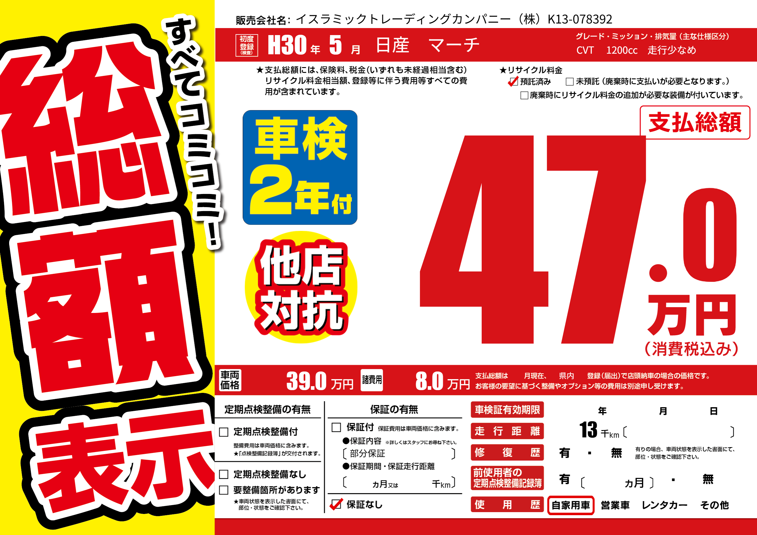 | 車名 | 日産 マーチ | グレード ミッション 排気量 |