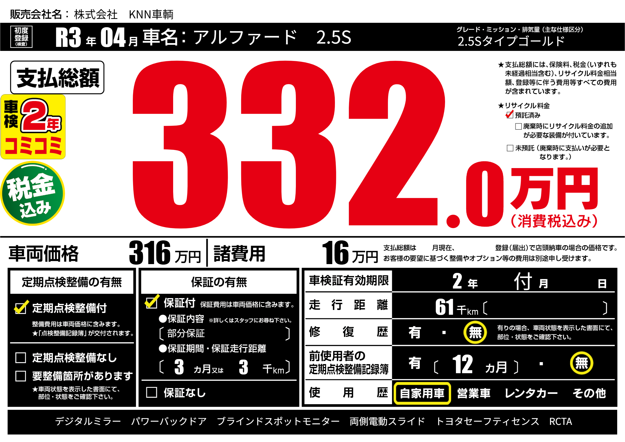 | 定期点検整備 | 定期点検整備あり | ||