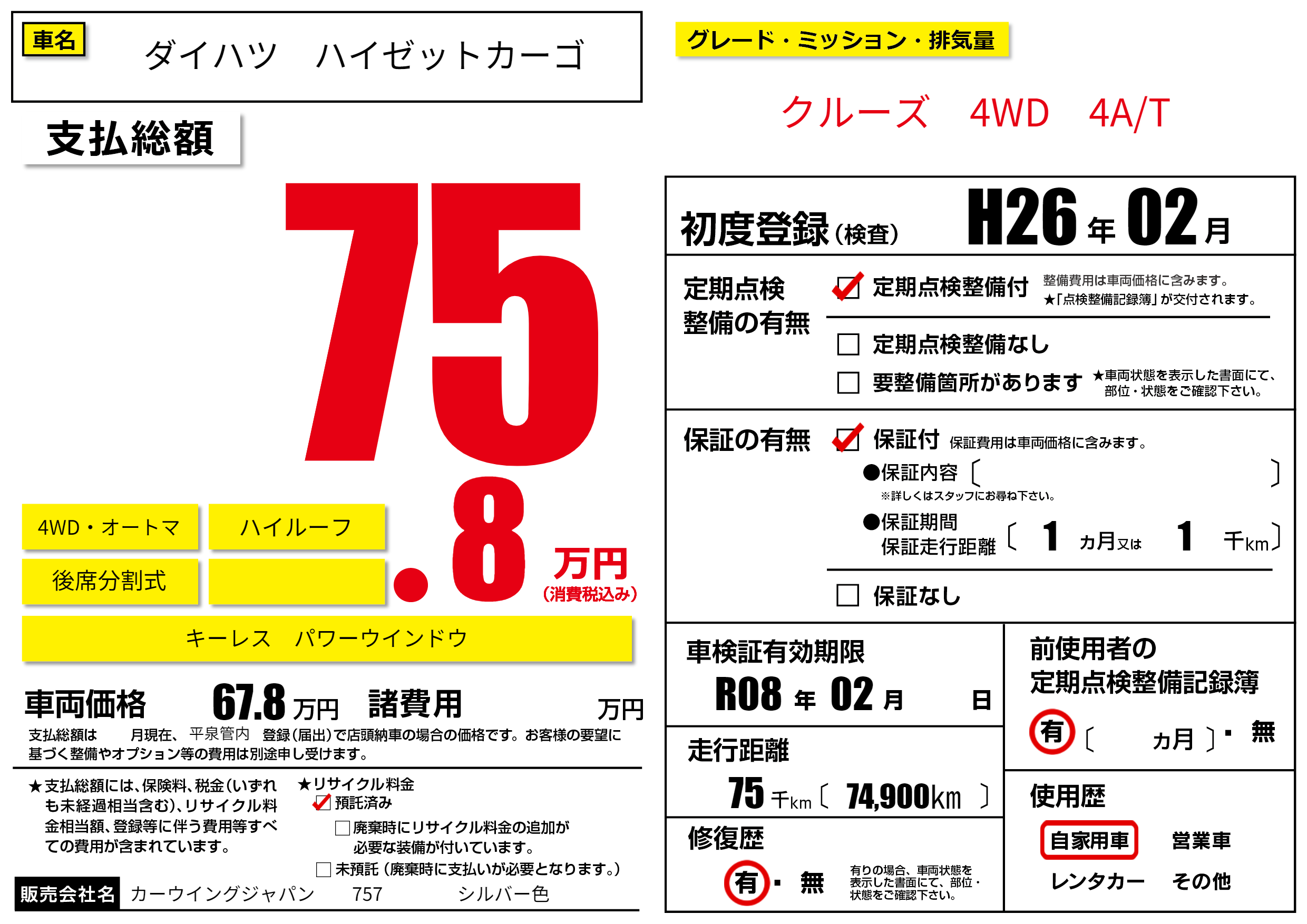 | 車名 | ダイハツ ハイゼットカーゴ | グレード ミッション 排気量 |