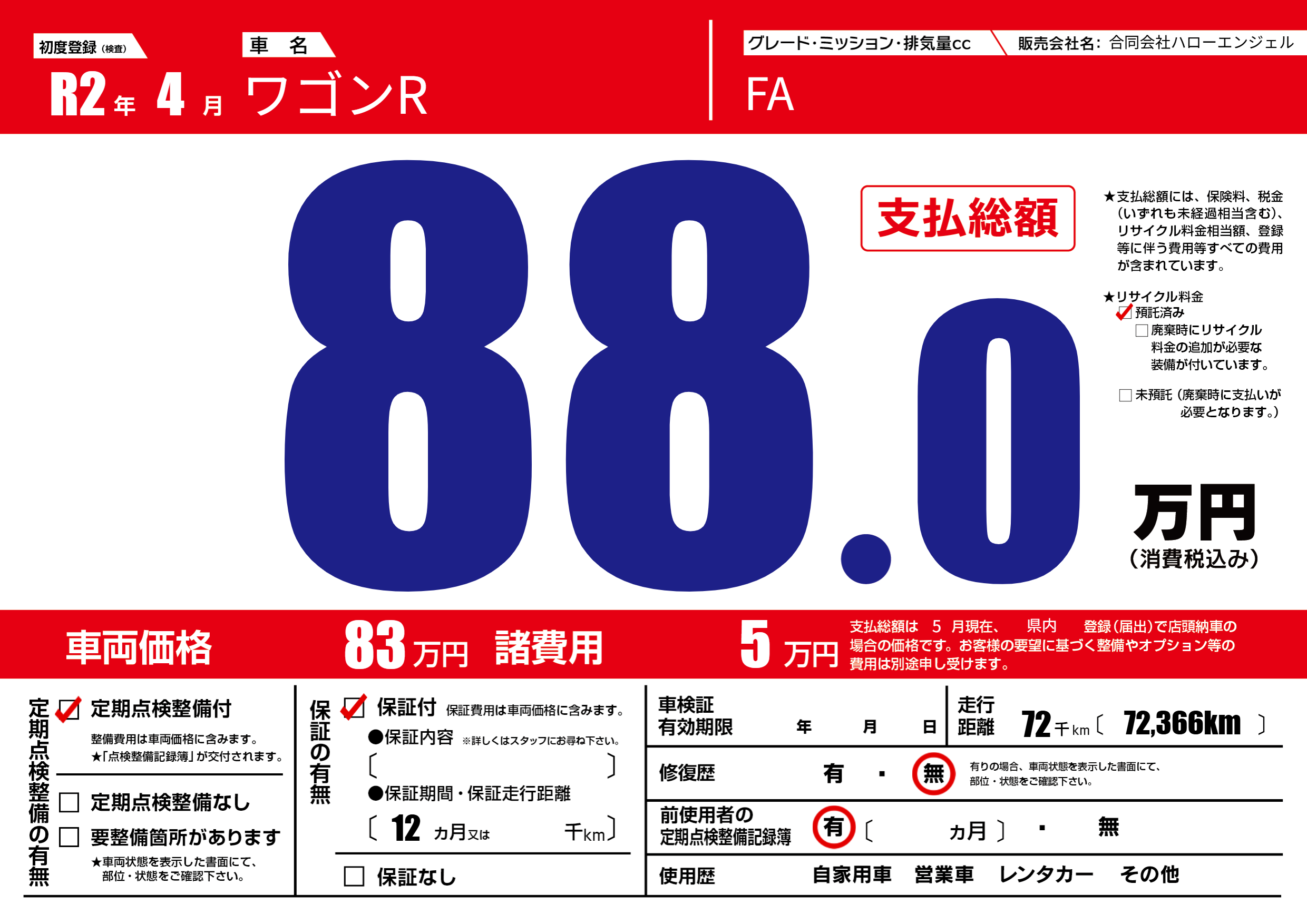 | 車名 | ワゴンR | グレード ミッション 排気量 |