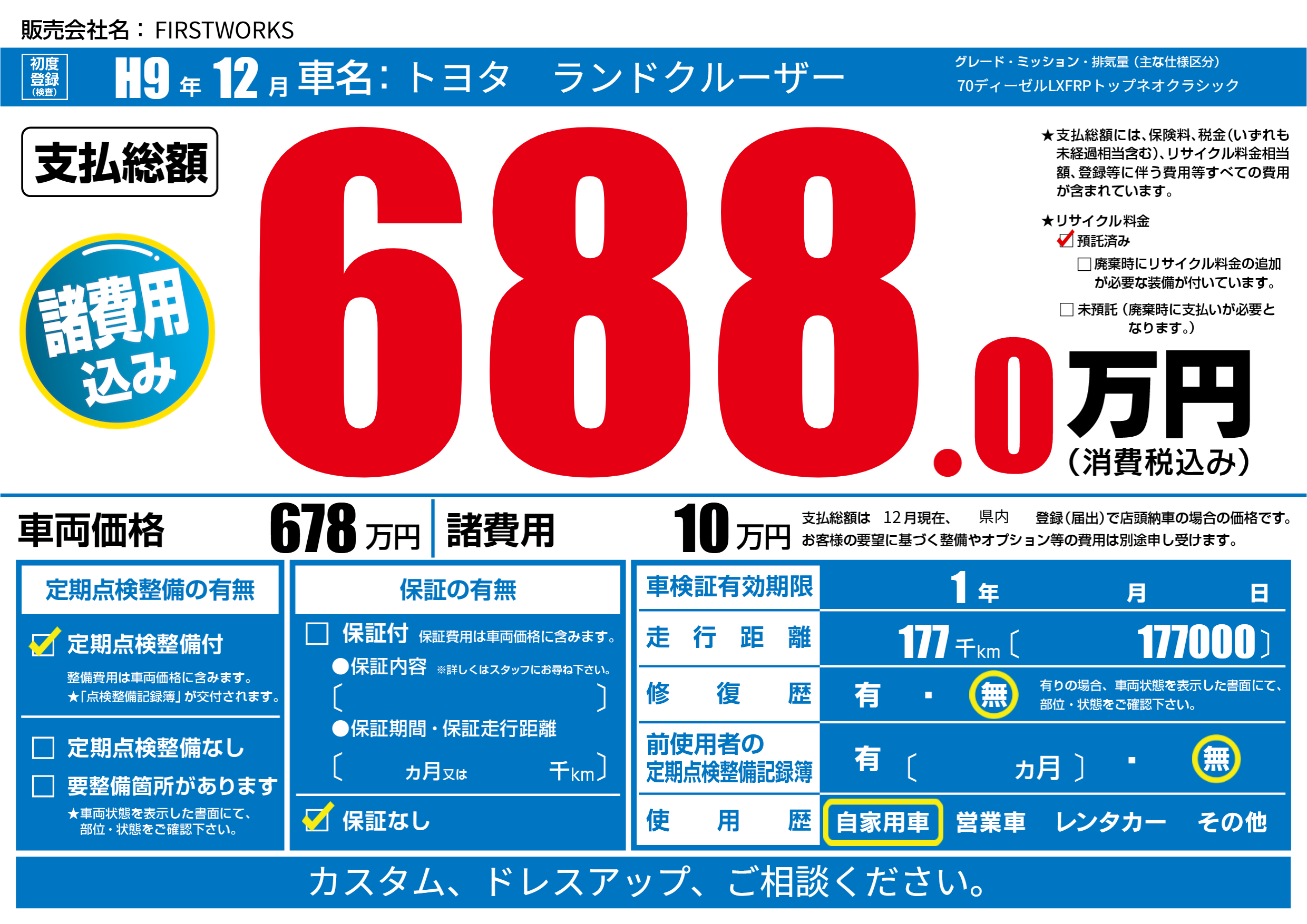 | 車名 | トヨタ ランドクルーザー | グレード ミッション 排気量 |