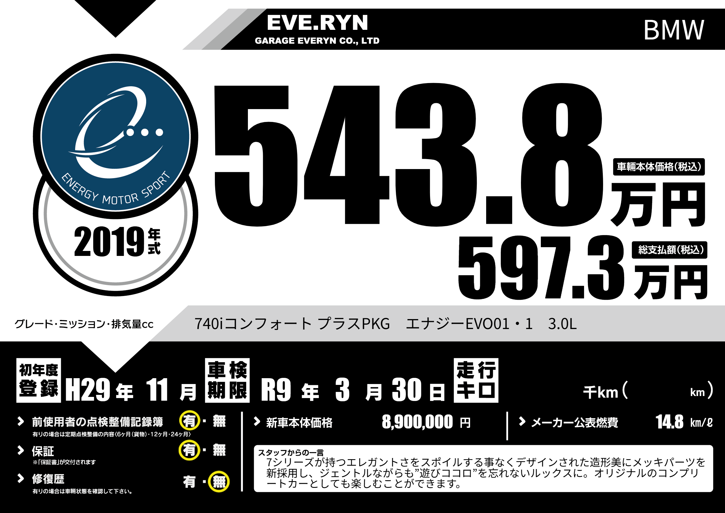 740iコンフォート プラスPKG エナジーEVO01・1 3.0L |