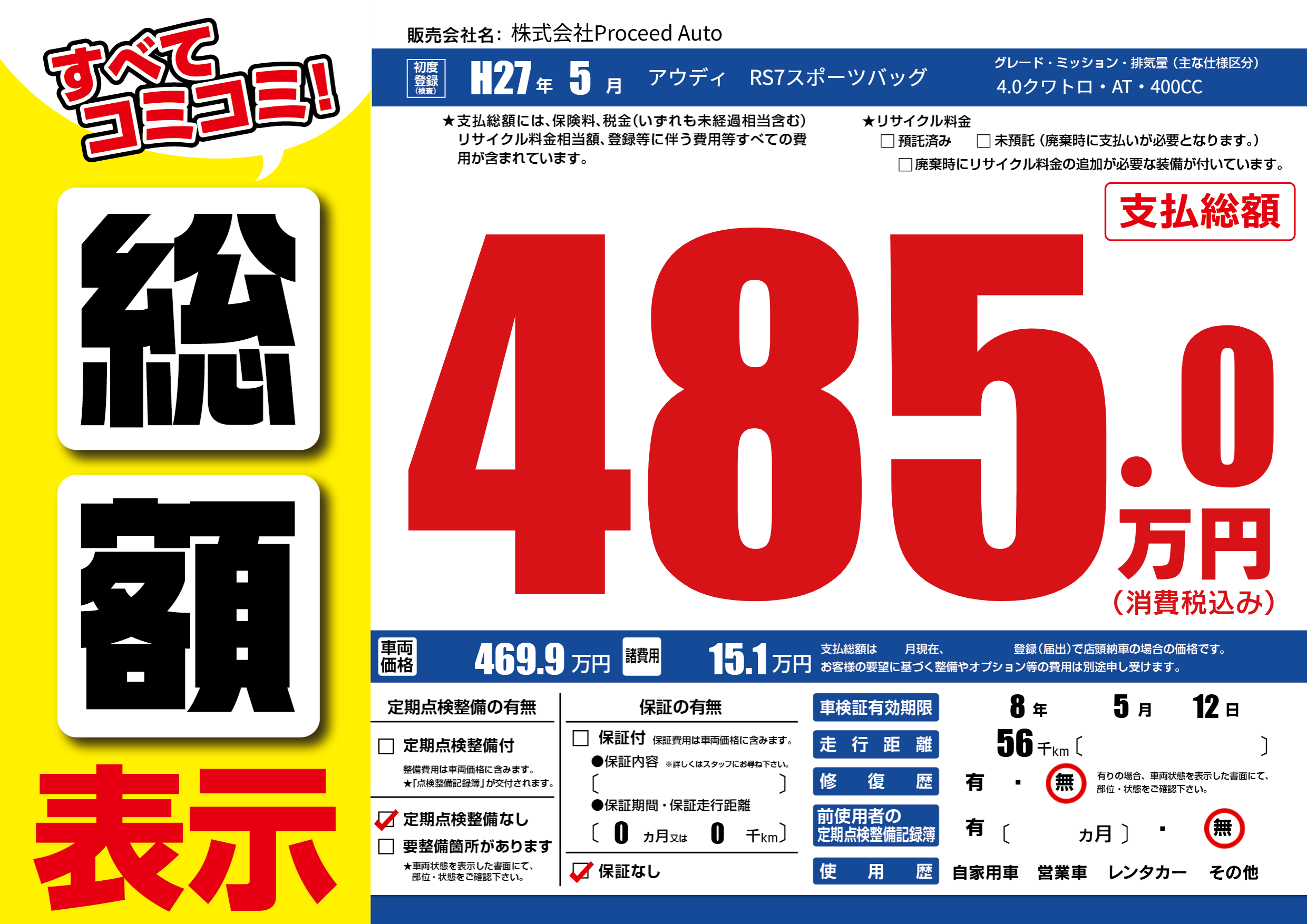 | 車名 | アウディ RS7スポーツバッグ | グレード ミッション 排気量 |