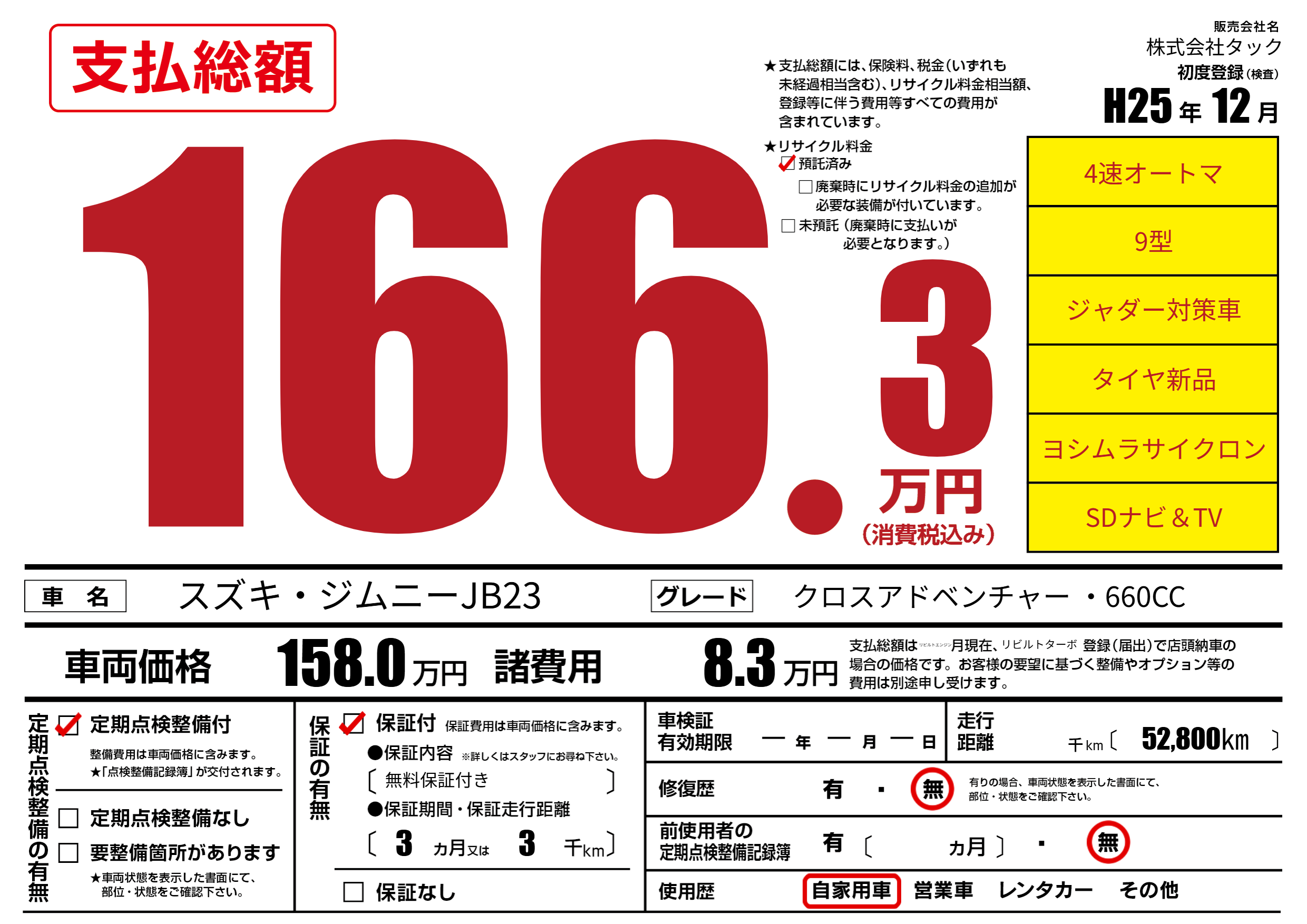 | 車名 | スズキ・ジムニーJB23 | グレード ミッション 排気量 |