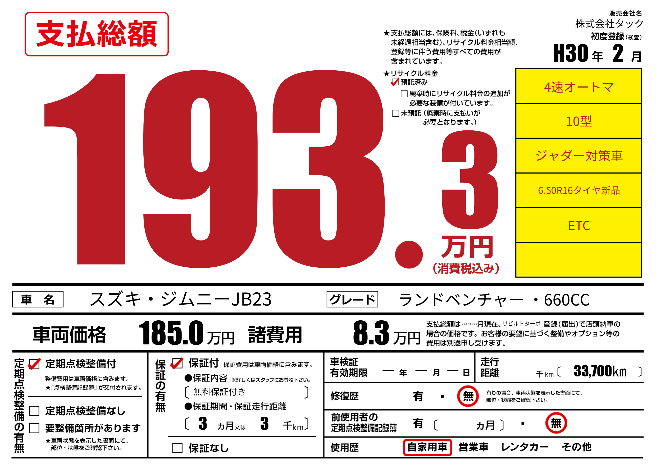 | 車名 | スズキ・ジムニーJB23 | グレード ミッション 排気量 |