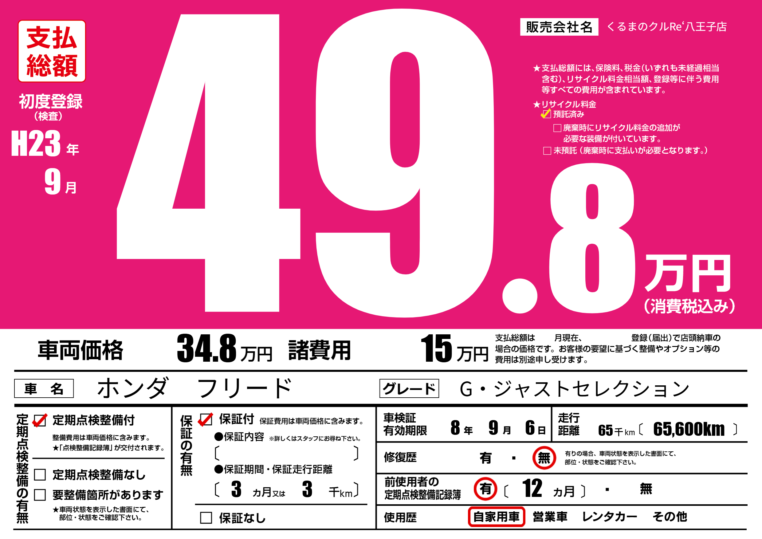 | 走行キロ | 6.5万km | 初年度登録 | H23年9月 |