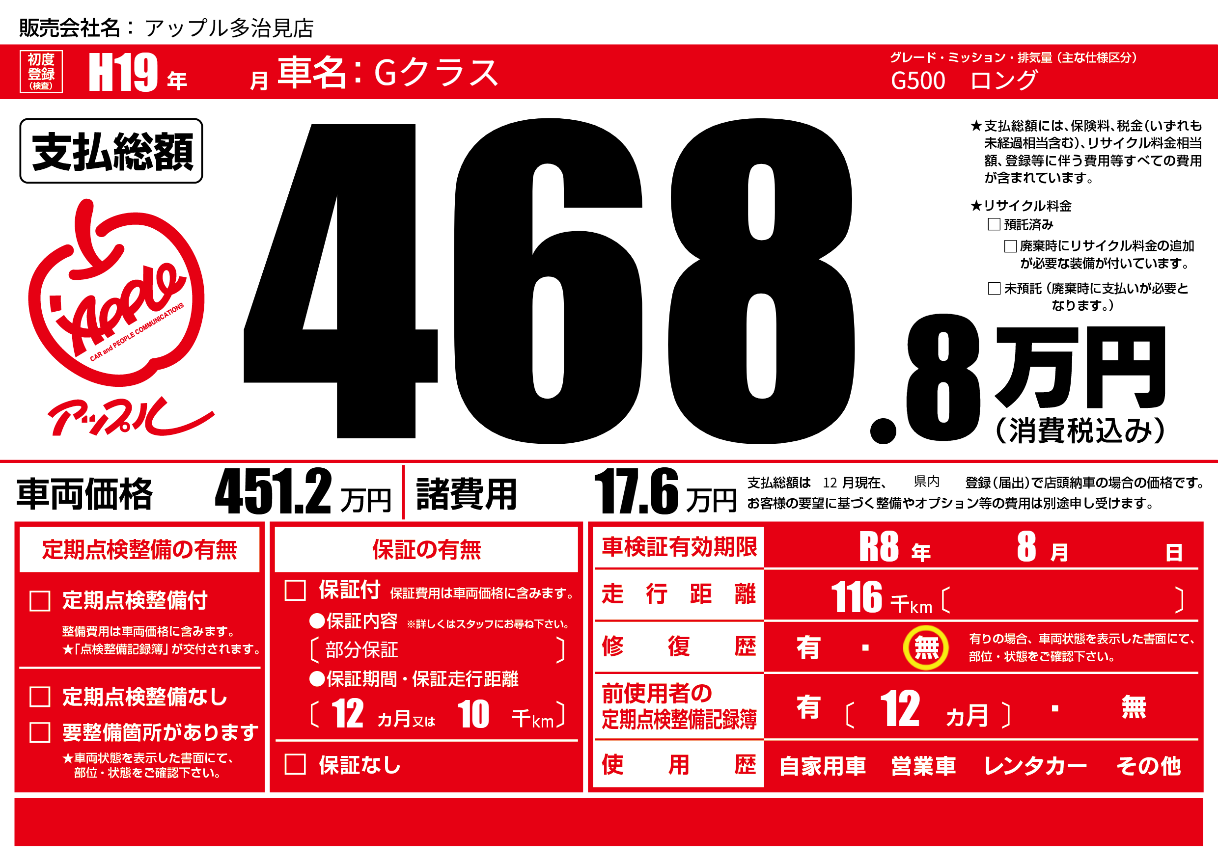 | 車名 | Gクラス | グレード ミッション 排気量 |
