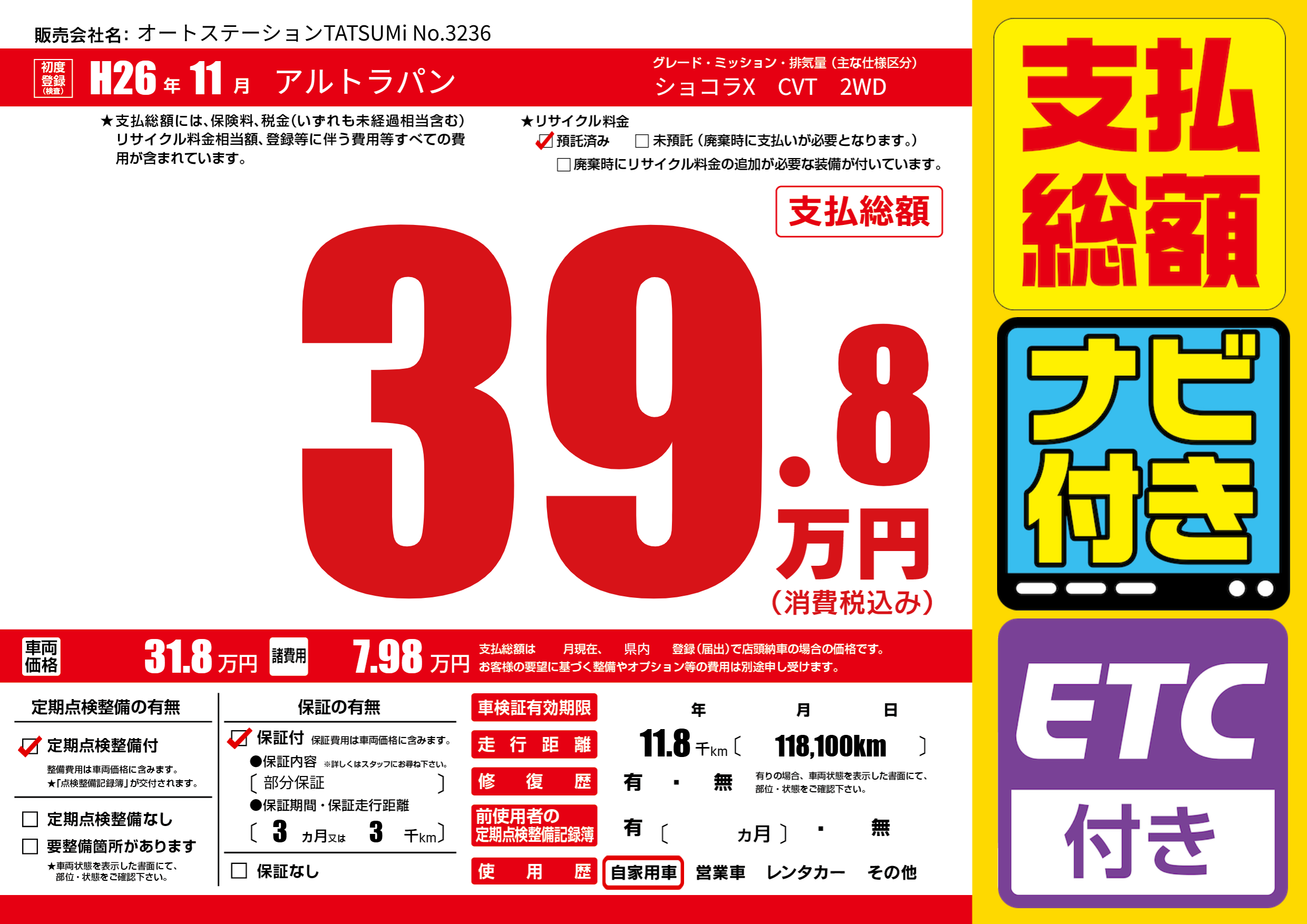 | 走行キロ | 1.1万km | 初年度登録 | H26年11月 |