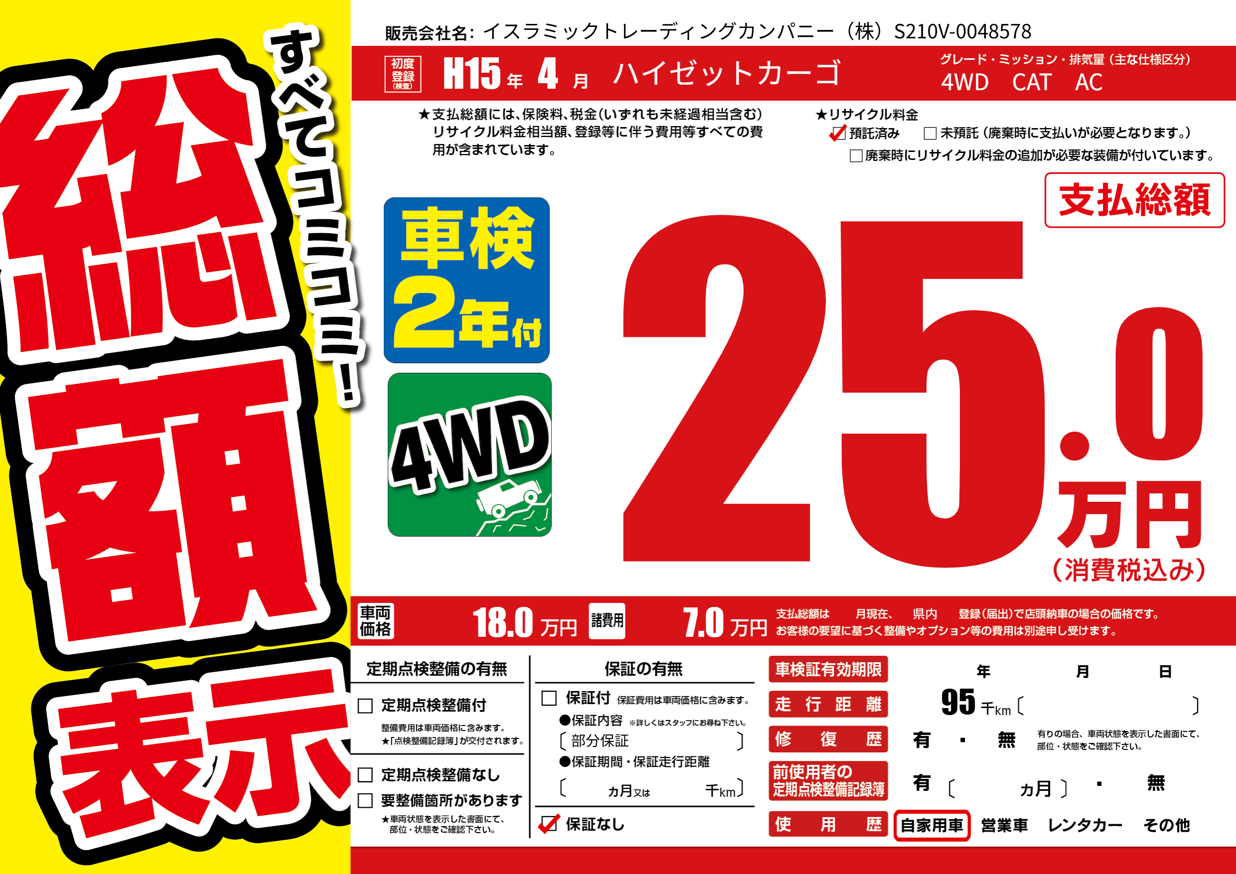 | 走行キロ | 9.5万km | 初年度登録 | H15年4月 |