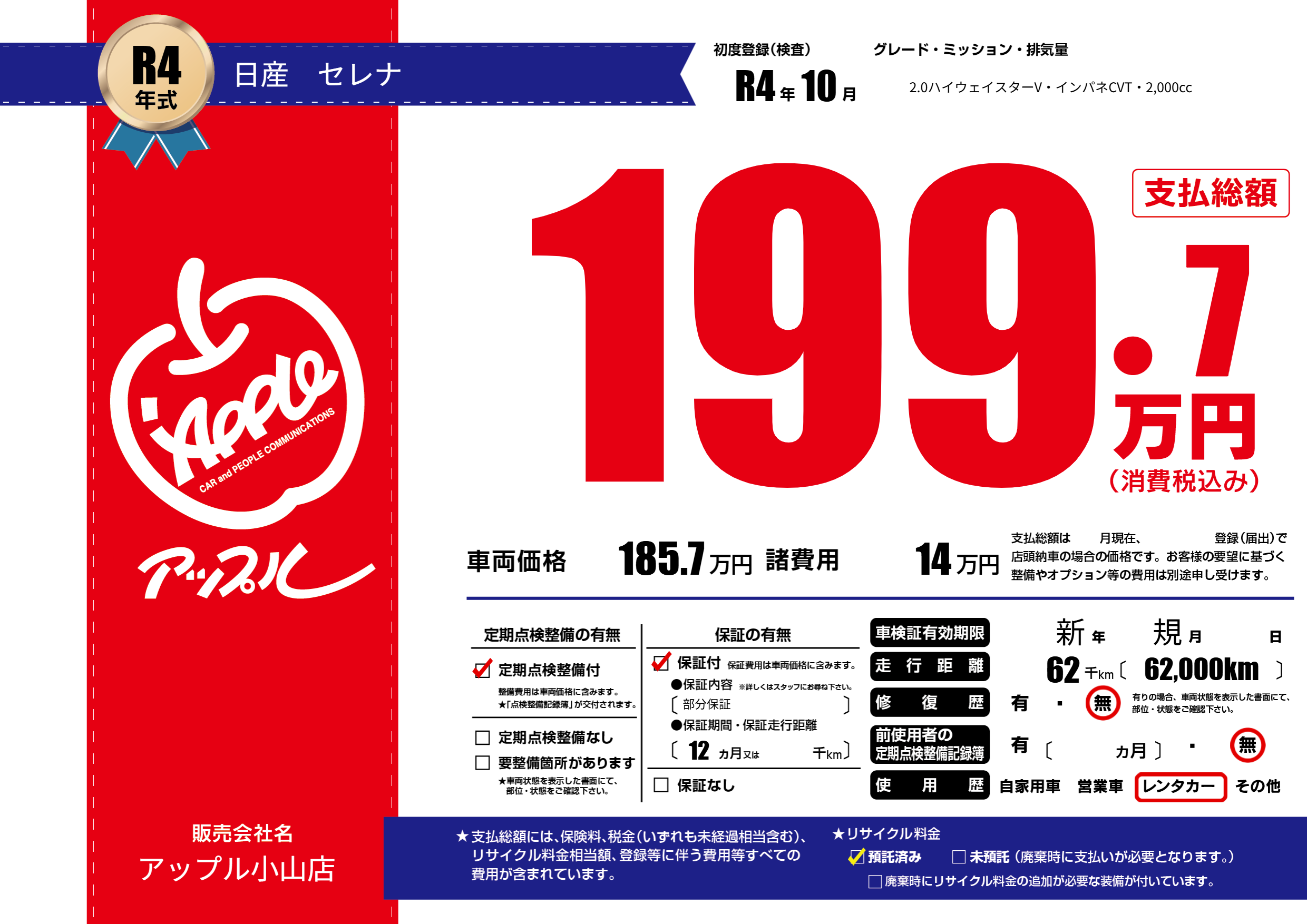 | 車名 | 日産 セレナ | グレード ミッション 排気量 |