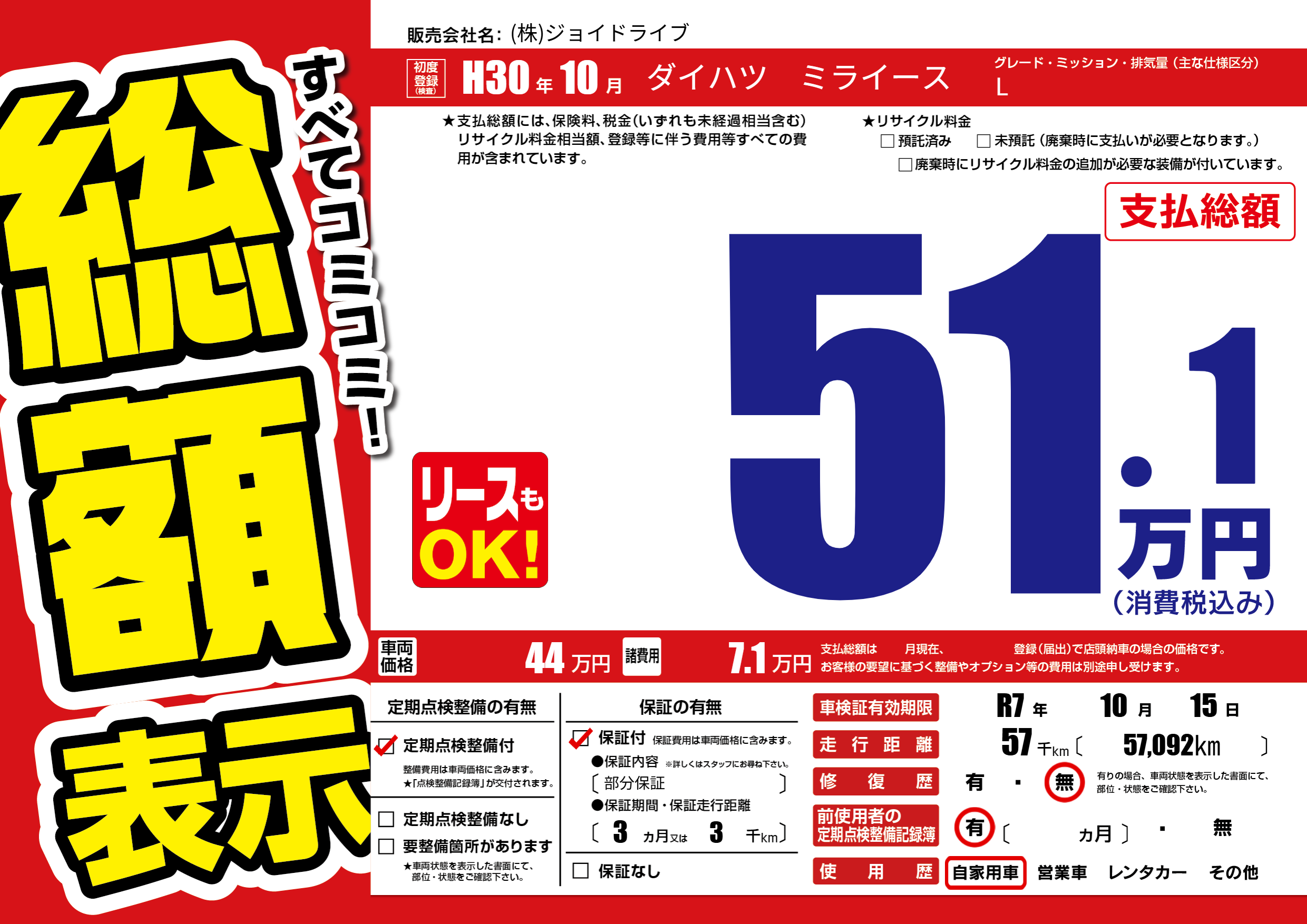 | 車名 | ダイハツ ミライース | グレード ミッション 排気量 |