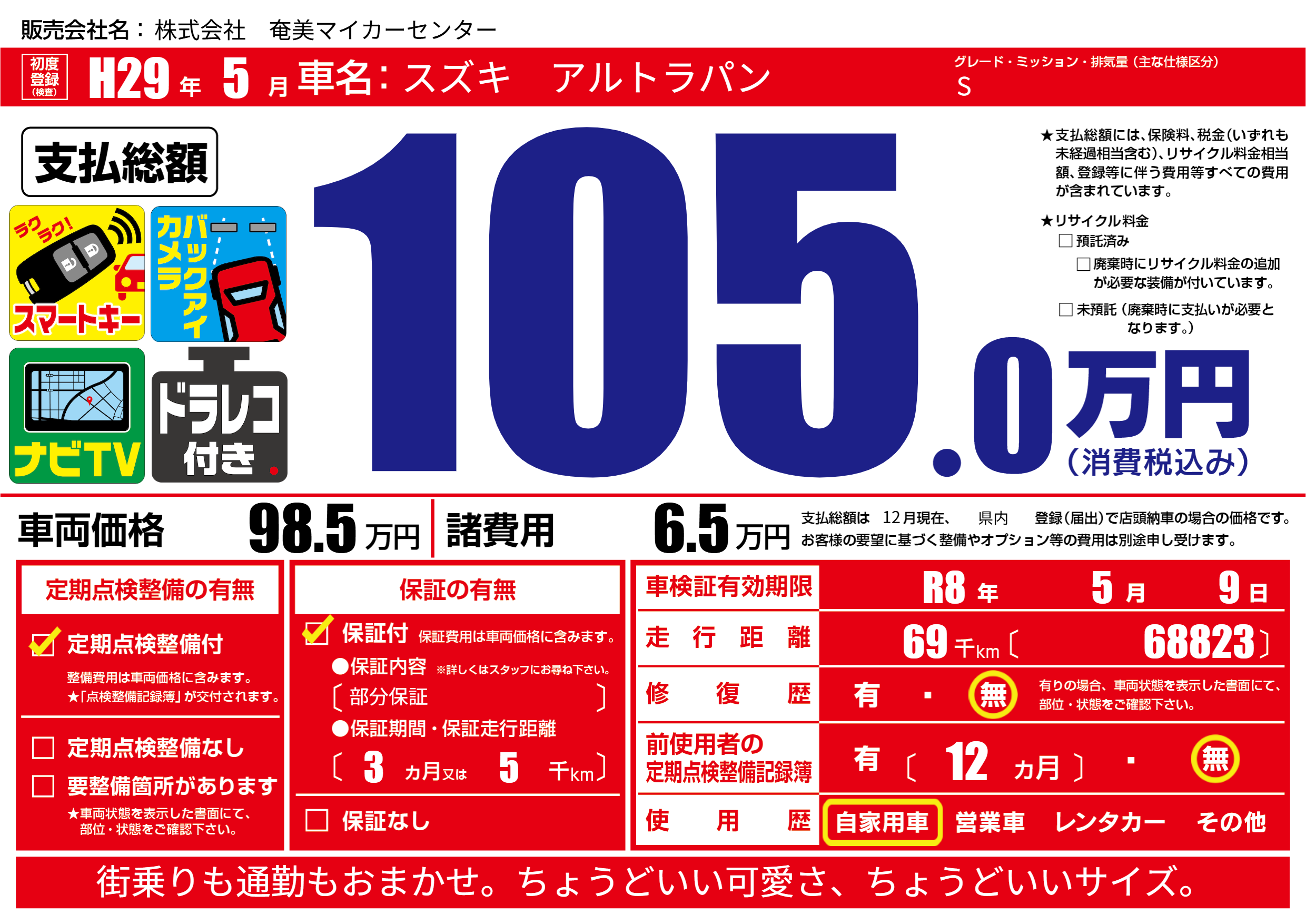 | 走行キロ | 6.9万km | 初年度登録 | H29年5月 |