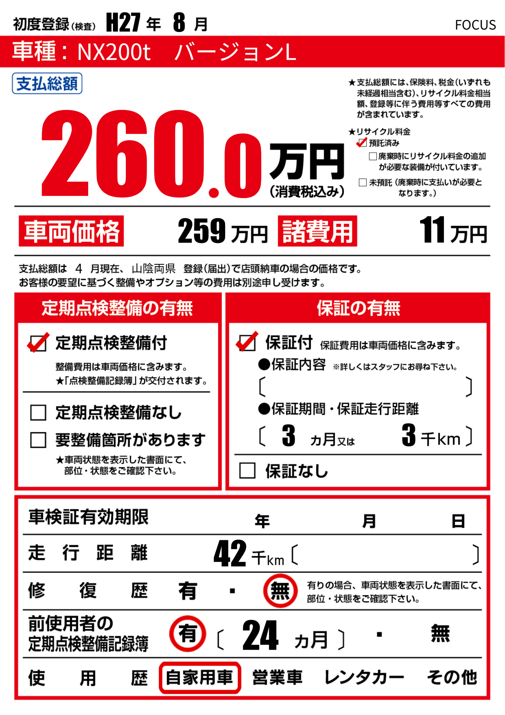 | 車名 | NX200t バージョンL | グレード ミッション 排気量 |