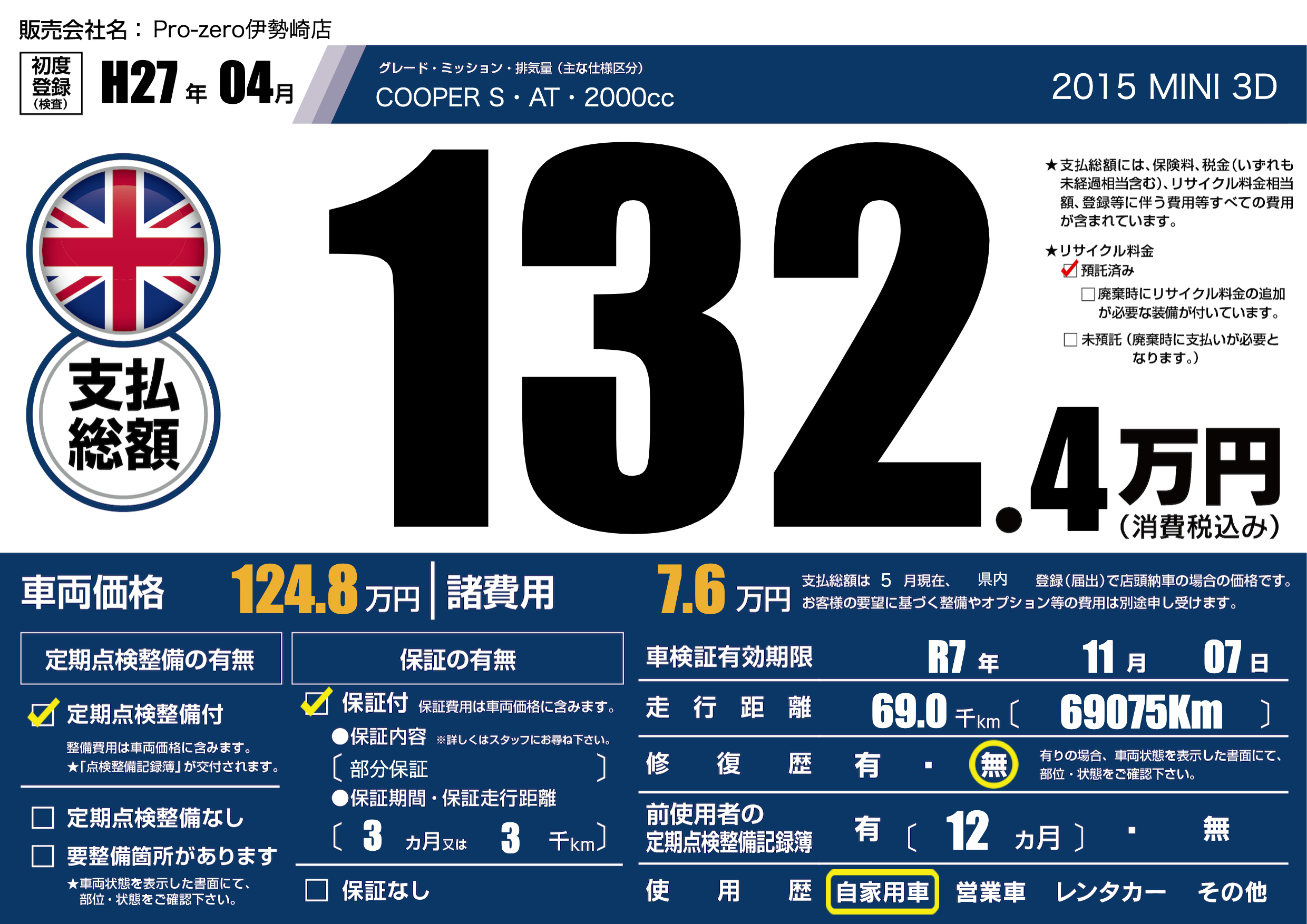 | 車名 | 2015 MINI 3D | グレード ミッション 排気量 |