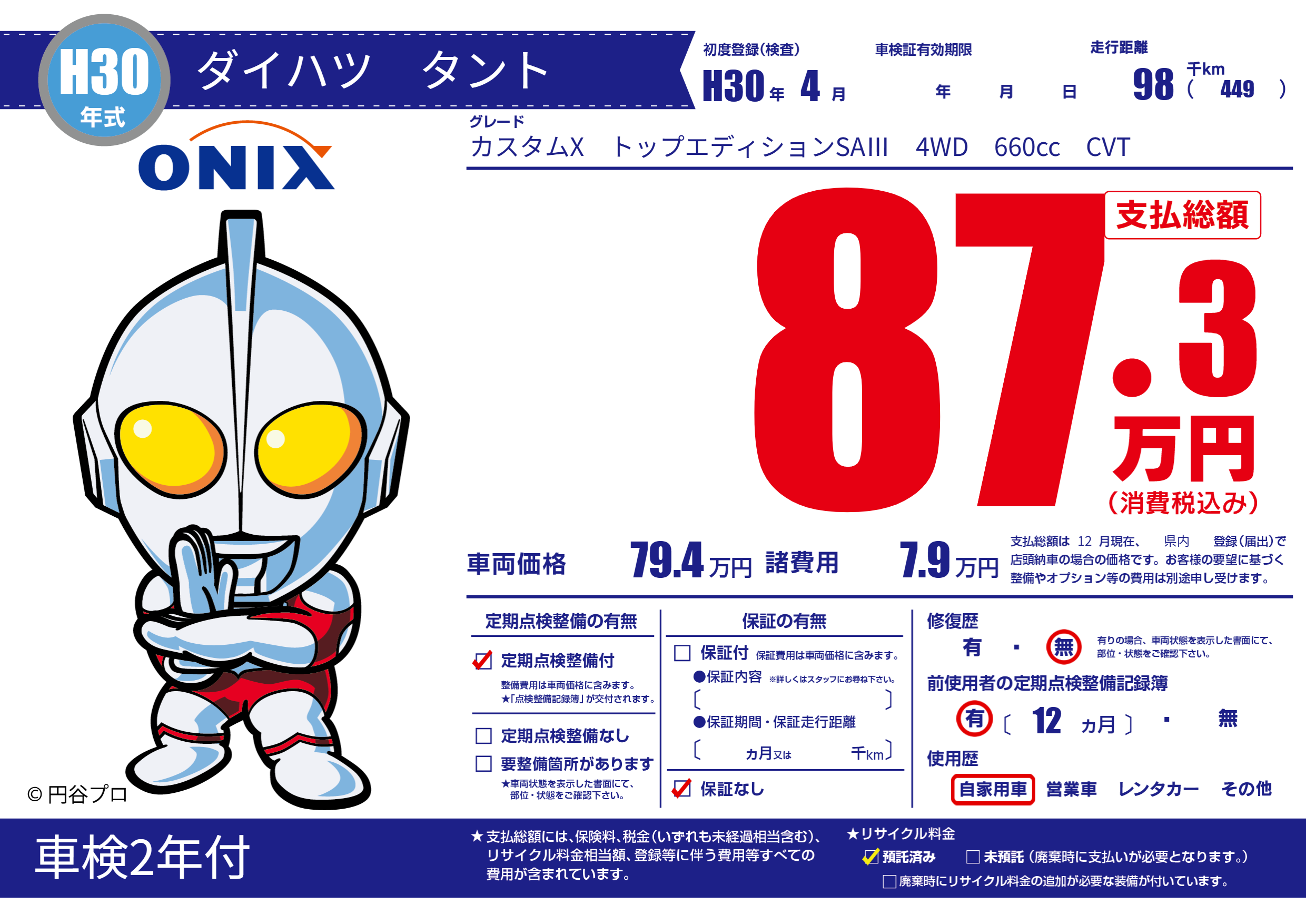 | 車名 | ダイハツ タント | グレード ミッション 排気量 |