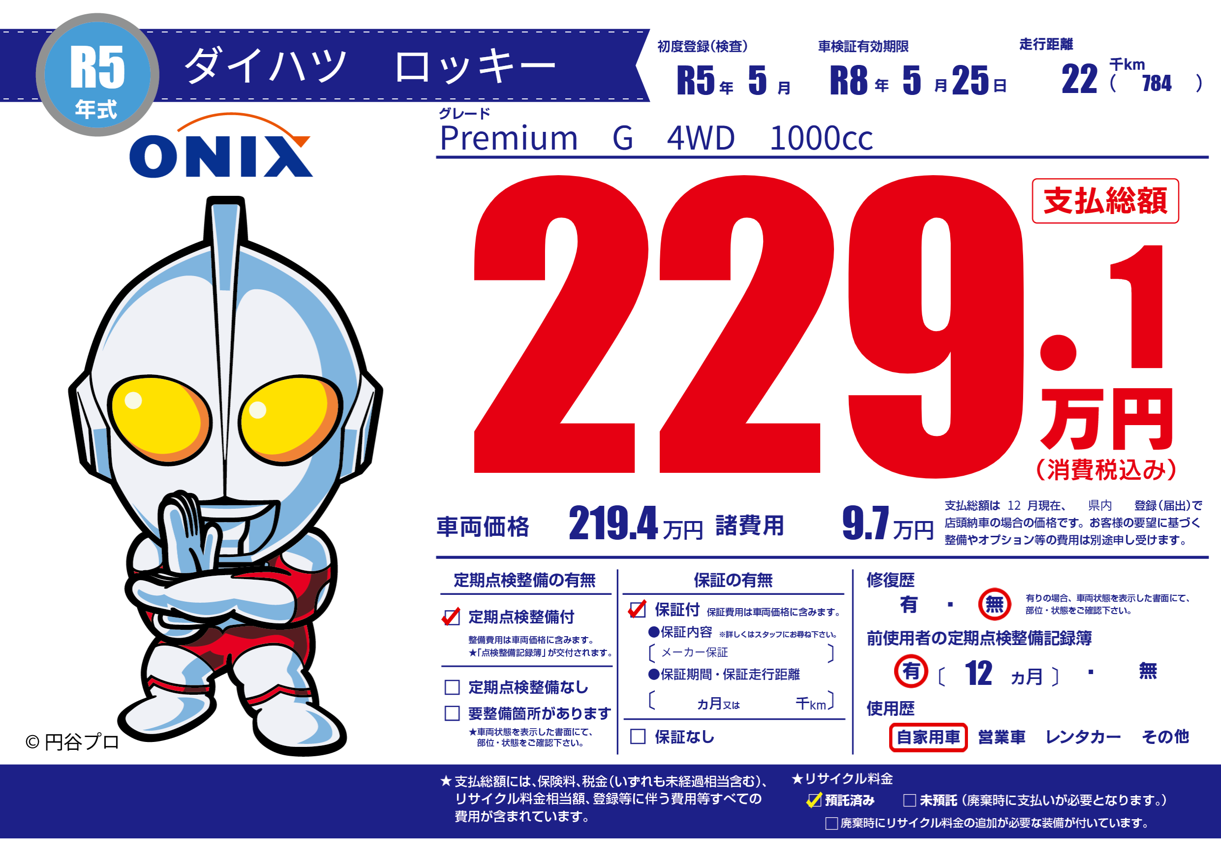| 走行キロ | 2.2万km | 初年度登録 | R5年5月 |