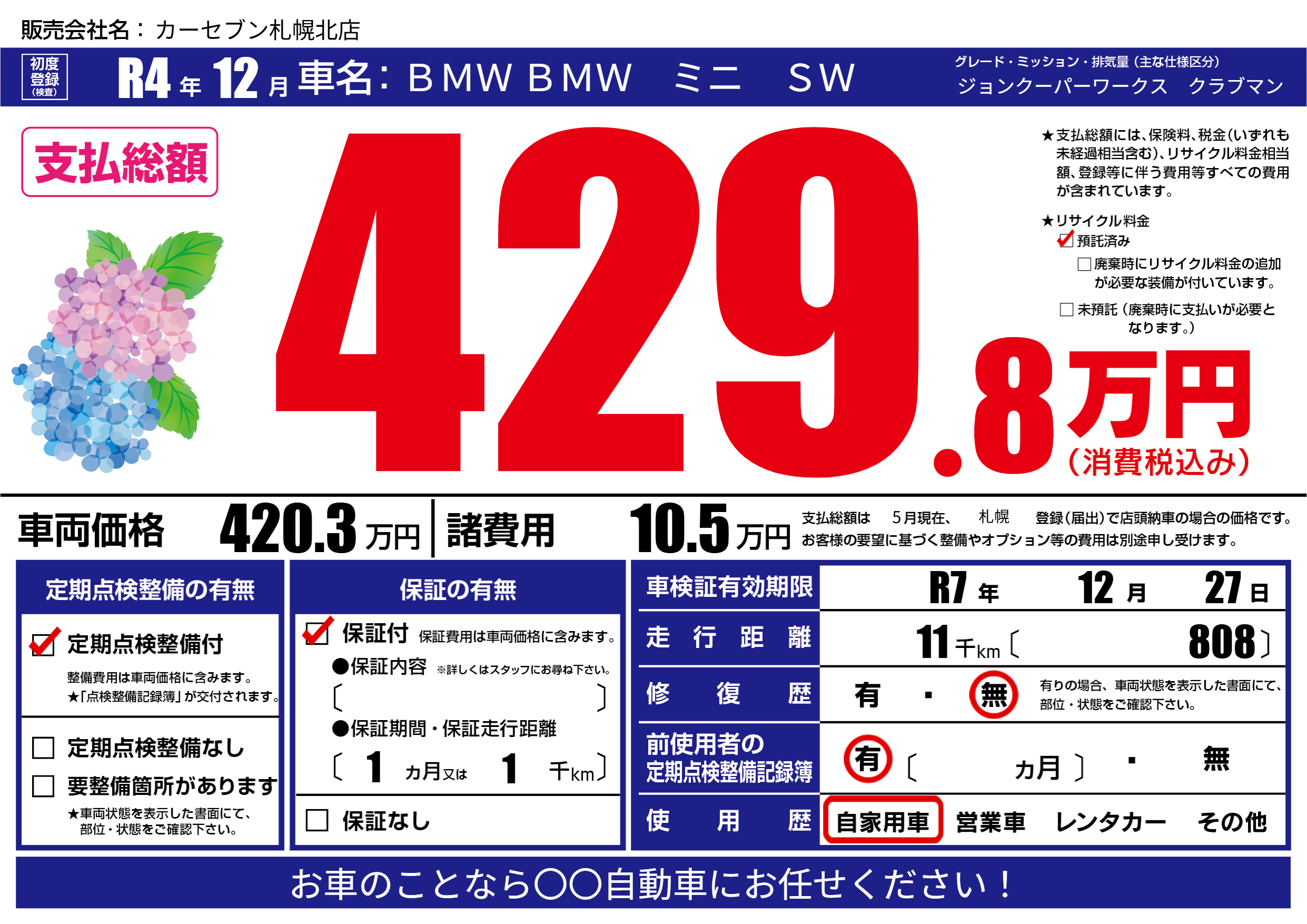 | 車名 | BMW BMW ミニ SW | グレード ミッション 排気量 |