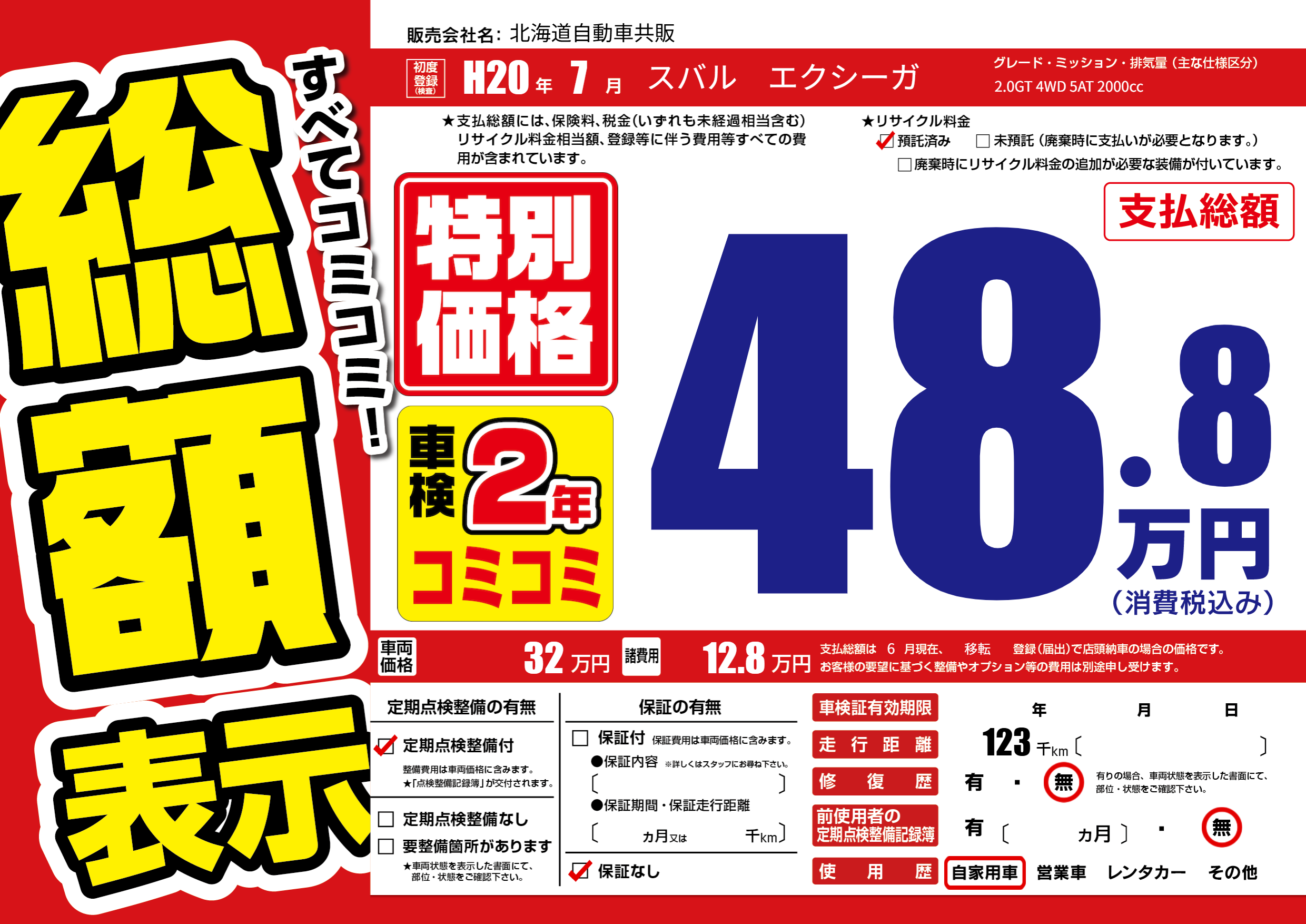 | 走行キロ | 12.3万km | 初年度登録 | H20年7月 |
