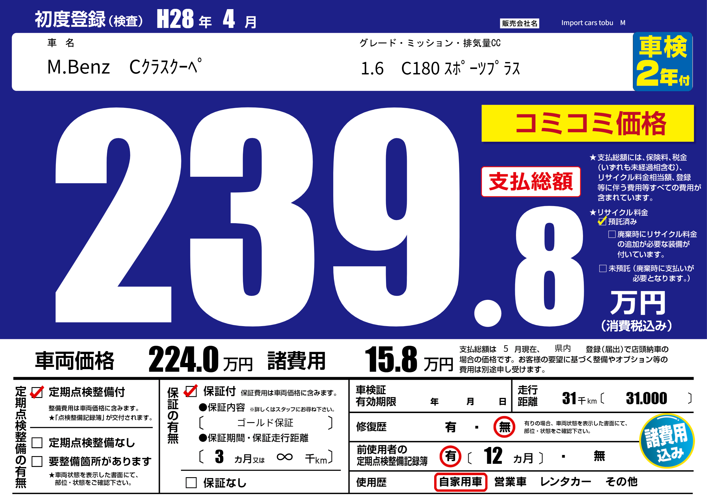 | 車名 | M.Benz Cクラスクーペ | グレード ミッション 排気量 |