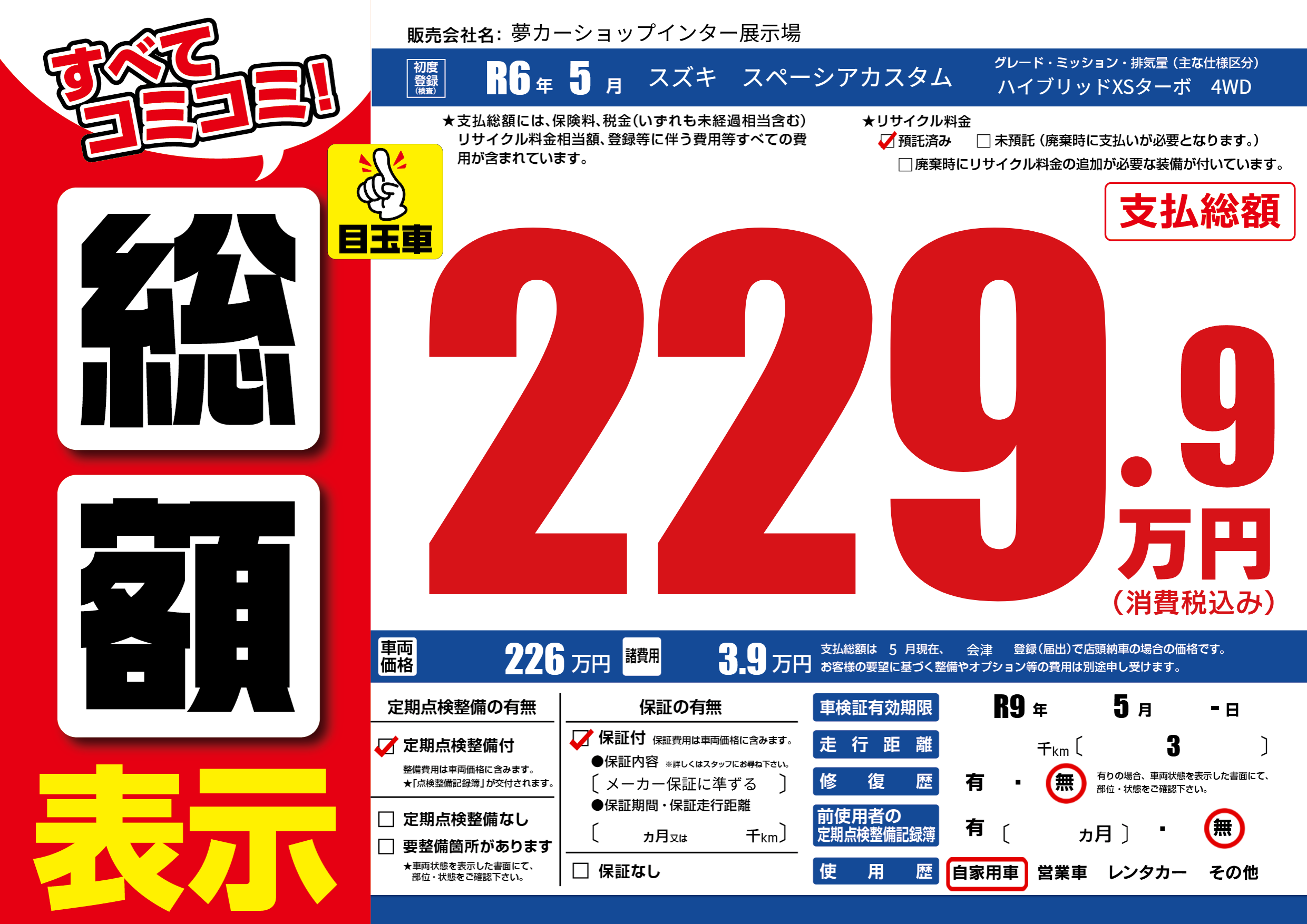 | 車検制限 | R9年 5月 -日 | ||