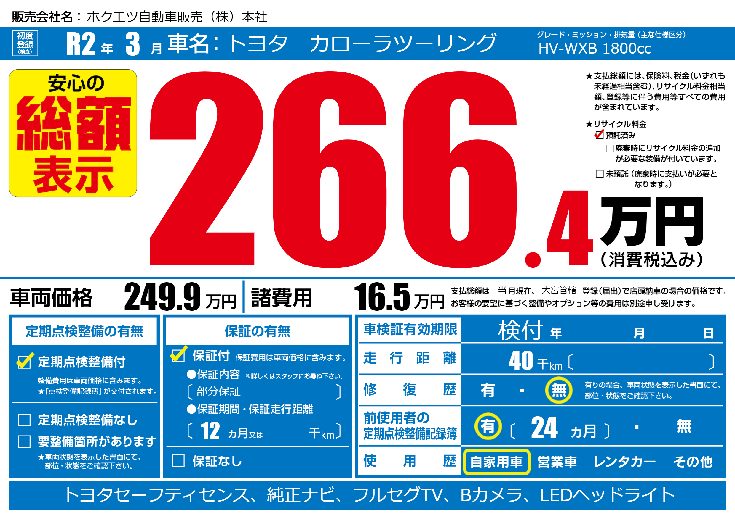 | 車名 | トヨタ カローラツーリング | グレード ミッション 排気量 |