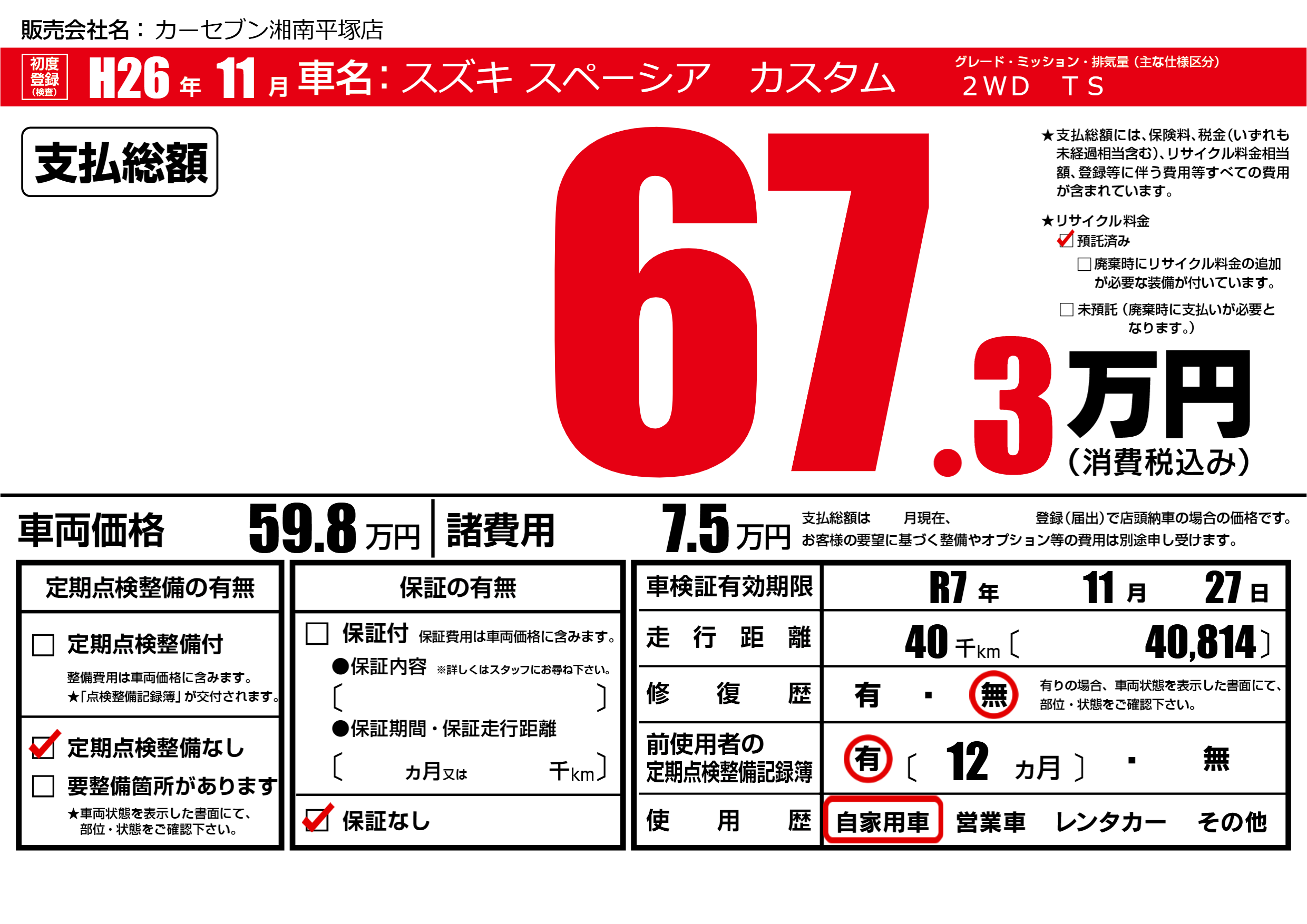 | 走行キロ | 4万km | 初年度登録 | H26年11月 |
