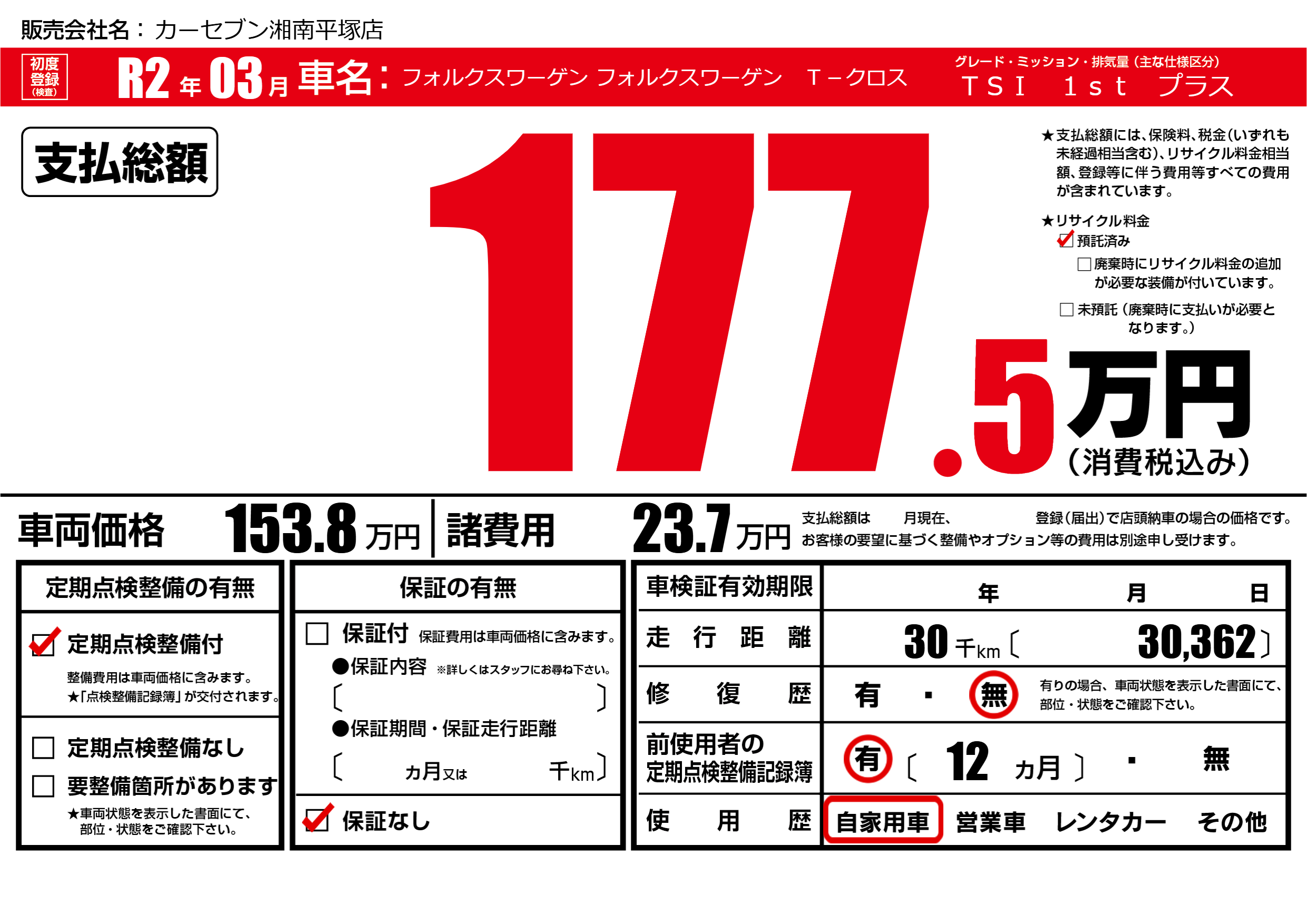 | 車名 | フォルクスワーゲン フォルクスワーゲン T-クロス | グレード ミッション 排気量 |