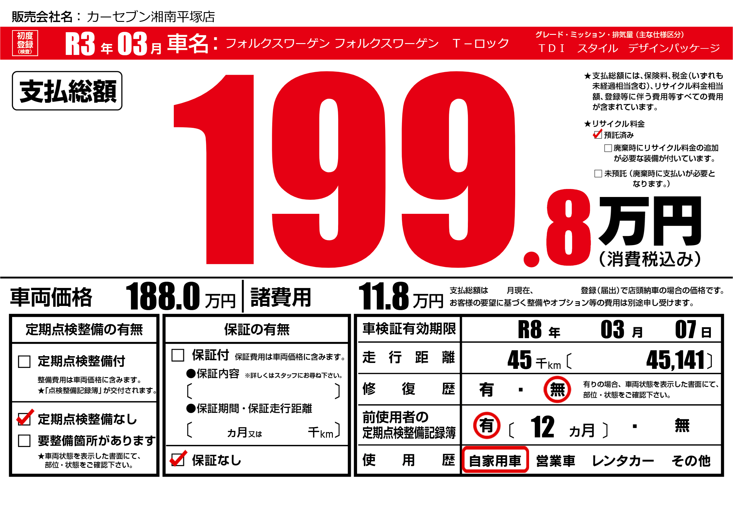 | 車名 | フォルクスワーゲン フォルクスワーゲン T-ロック | グレード ミッション 排気量 |