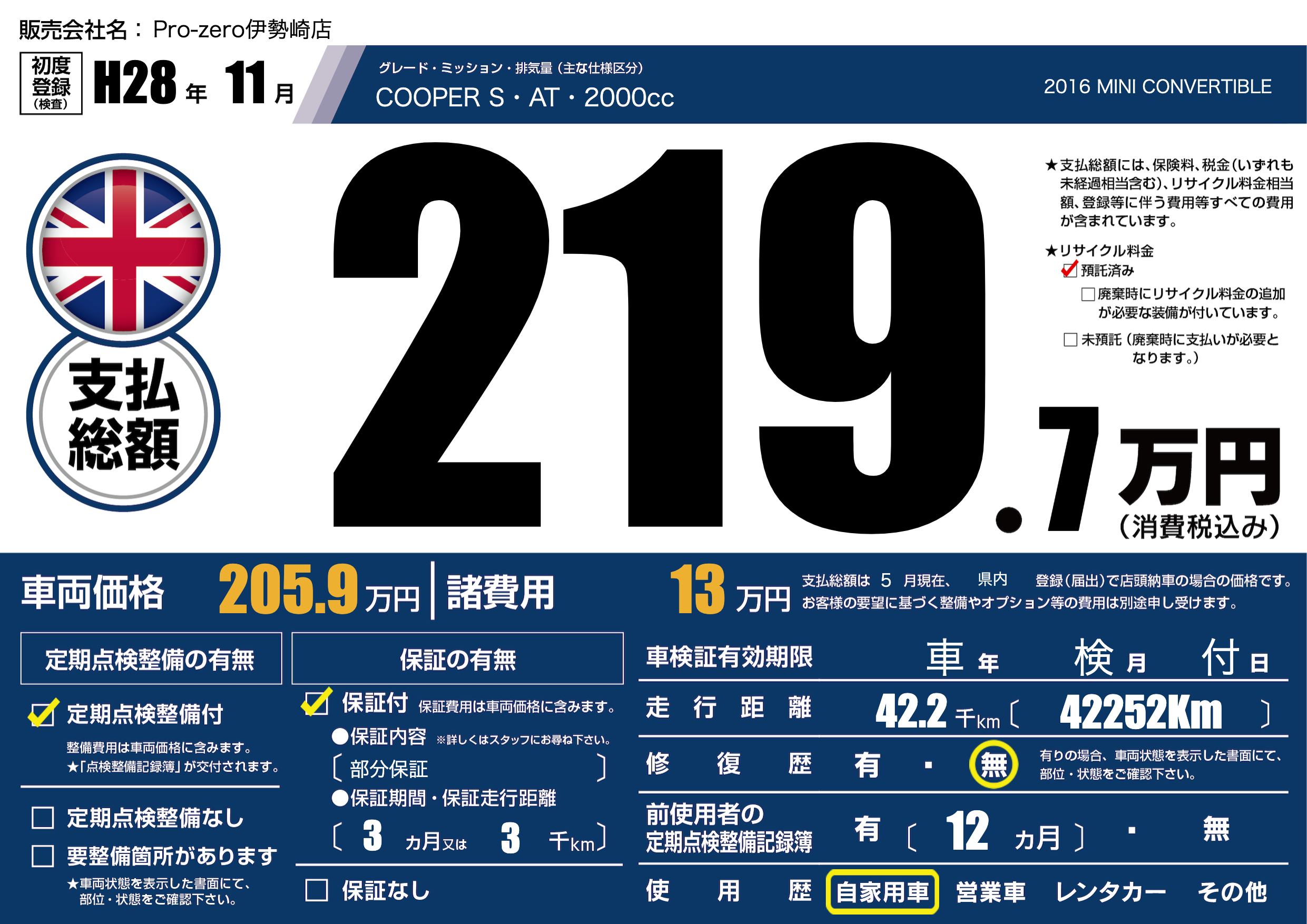 | 車名 | 2016 MINI CONVERTIBLE | グレード ミッション 排気量 |